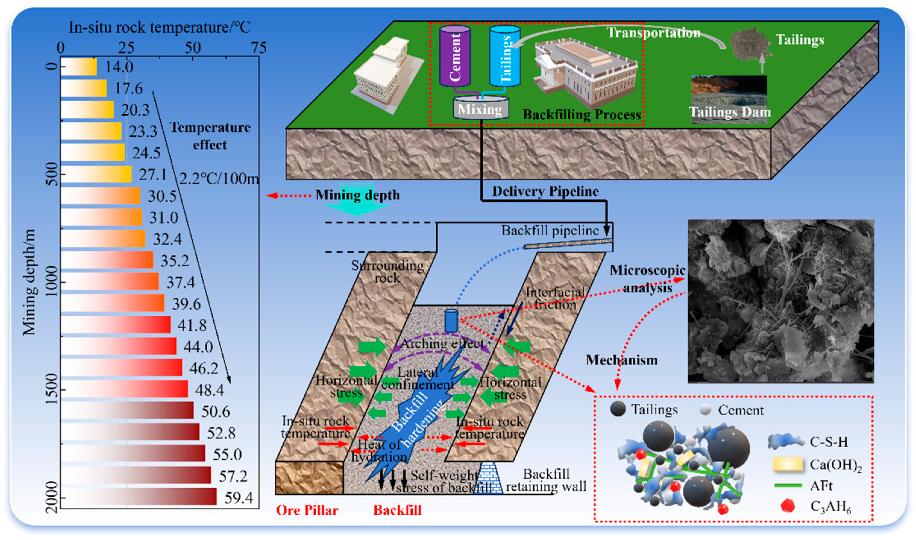 - Wang, Y.; Cao, Y.; Cao, C.; Wang, H. Effect of curing temperature under deep mining conditions on the mechanical properties of cemented paste backfill. Minerals 2023, 13, 383. [Google Scholar] [CrossRef]