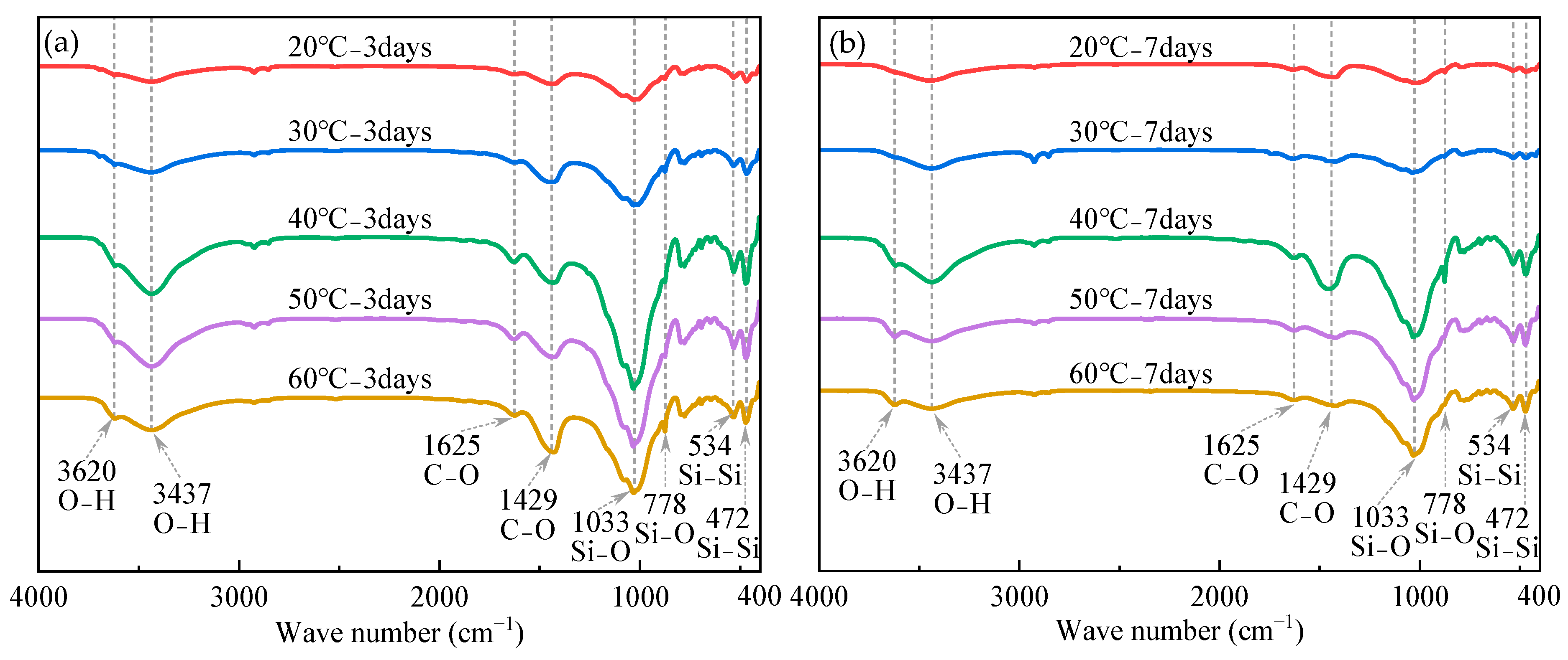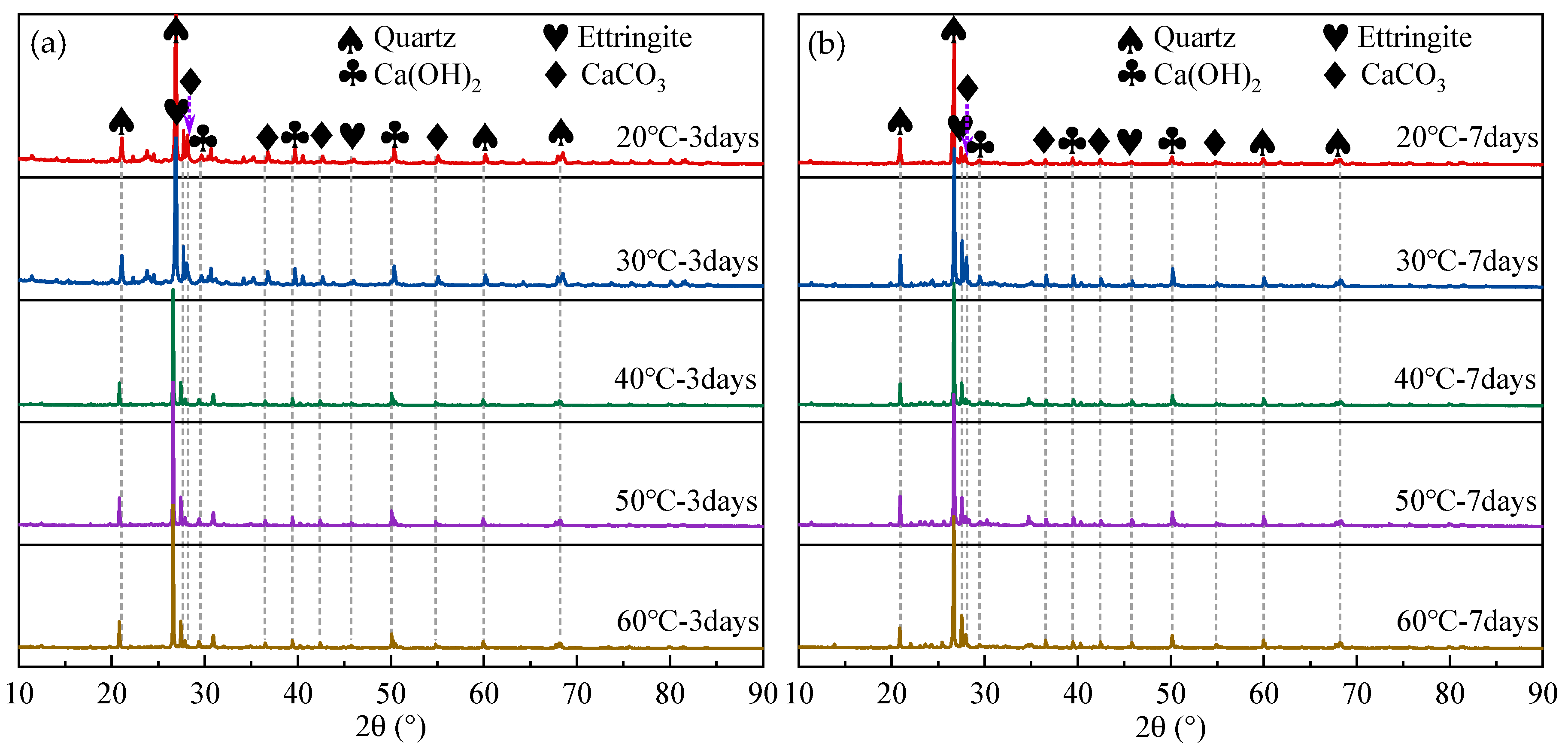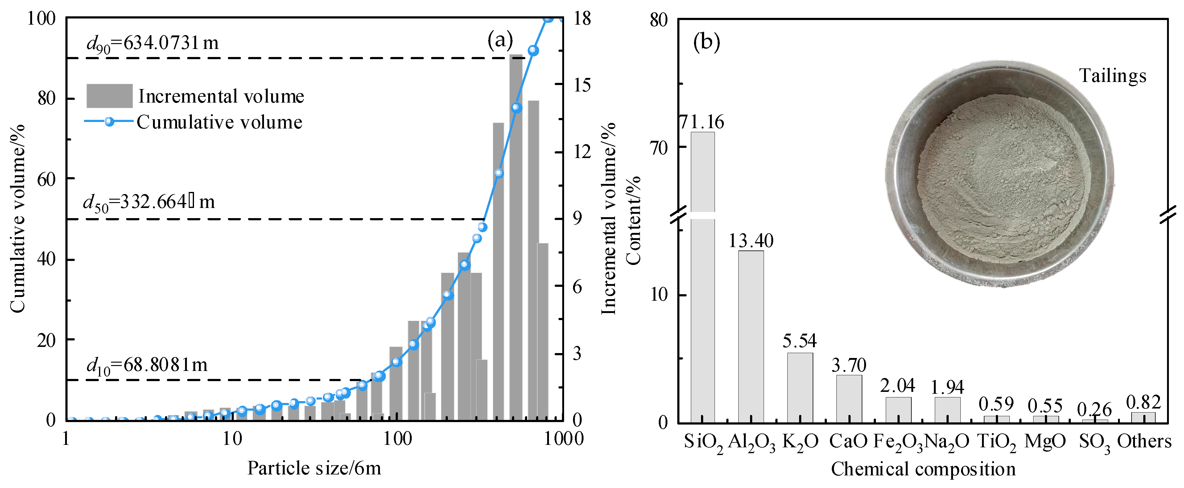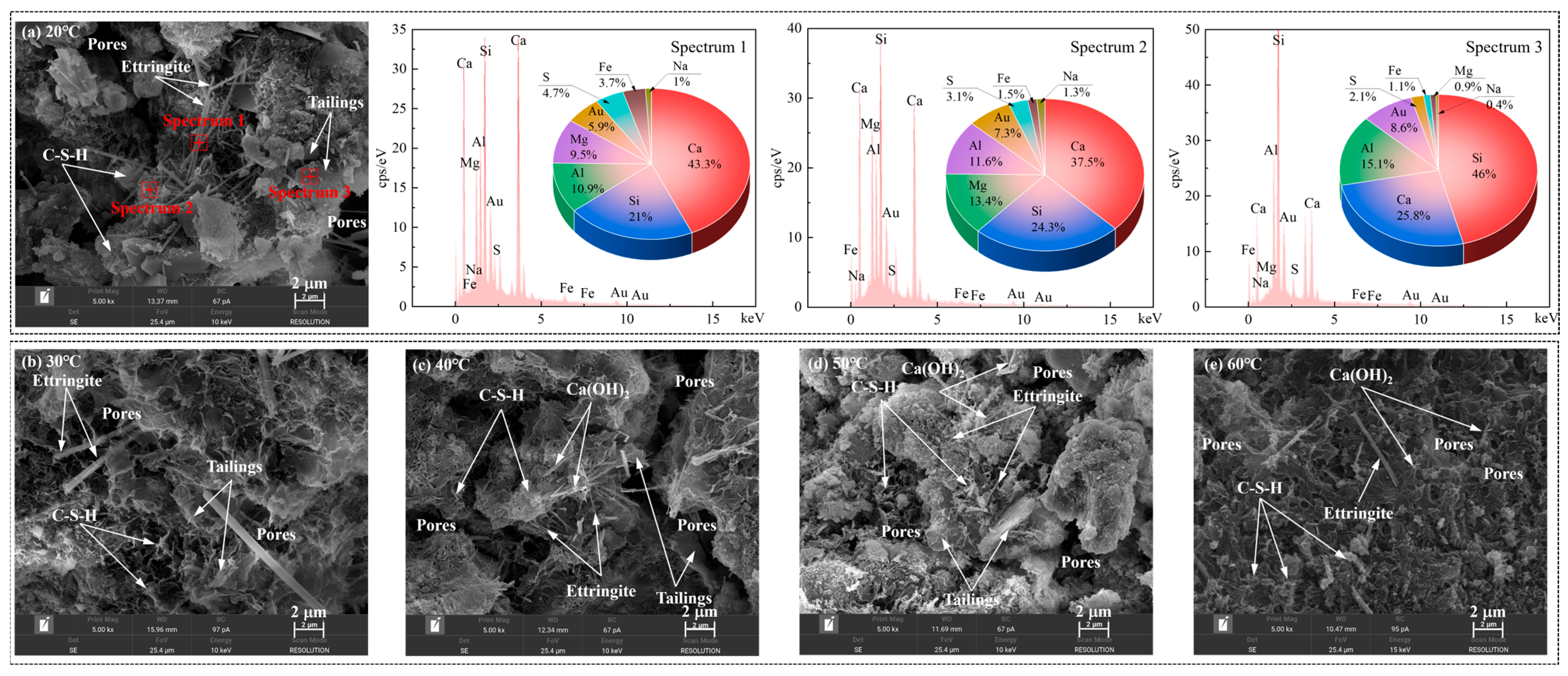 - Zhang, C.; Song, W.; Guo, J.; Taheri, A.; Wang, Y.; Wang, X. Hydration behavior, microstructural characteristics, and kinetic analysis of cemented tailings backfill under temperature effect. Case Stud. Constr. Mater. 2025, 23, e05081. [Google Scholar] [CrossRef]