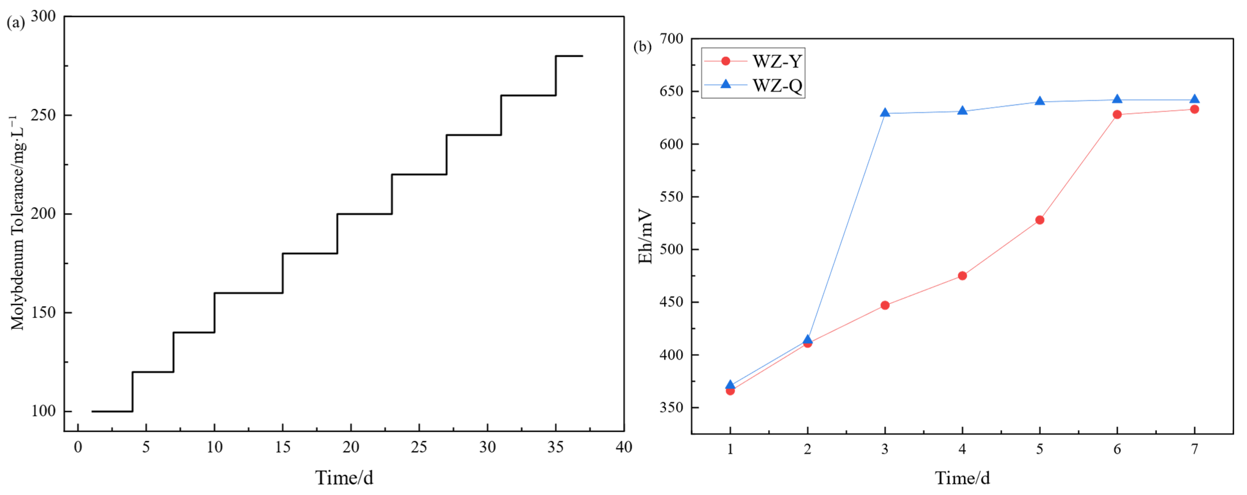 In view of the toxic effect of molybdenum on bacteria, bacteria were further adapted to higher molybdenum concentrations through domestication. The initial molybdenum concentration was set at 20 mg/L, and then increased by 280 mg/L during the transfer until the target molybdenum tolerance was achieved. This adapted bacteria, designated WZ-Q, served as the leaching bacteria in all subsequent experiments.