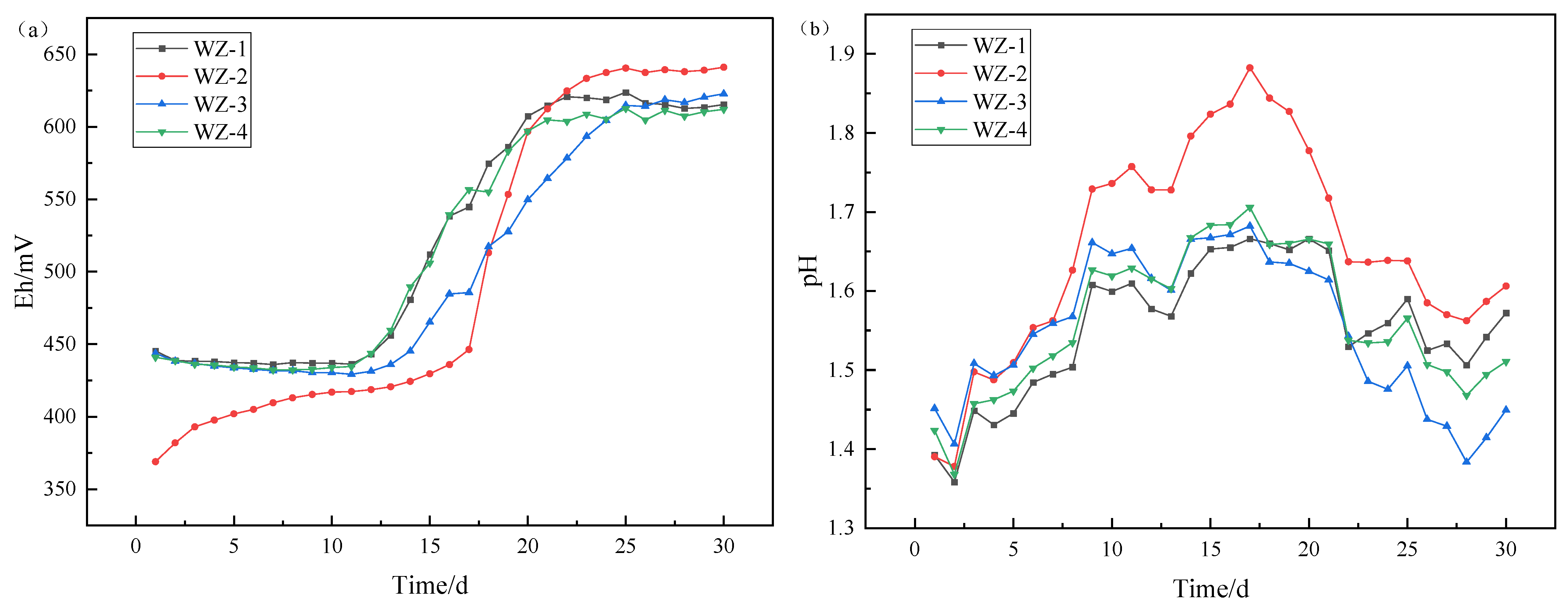 The pH of each leaching system showed a trend of first increasing and then decreasing. At the stage of pH rising, the main reaction was the acid consumption reaction of oxidized ore (containing calcium and magnesium), and reached equilibrium after a certain time of leaching. At the later stage of leaching, the decrease in pH value was mainly due to the acid production of sulfur-oxidizing bacteria. Due to the addition of additional sulfur sources in the WZ-3 system, microorganisms produce more acids, which is reflected in the fact that the pH value of this group is lower than that of other groups. Since pyrite contains more sulfur than black shale, the pH of group WZ-4 is lower than that of the control group and ferrous group.