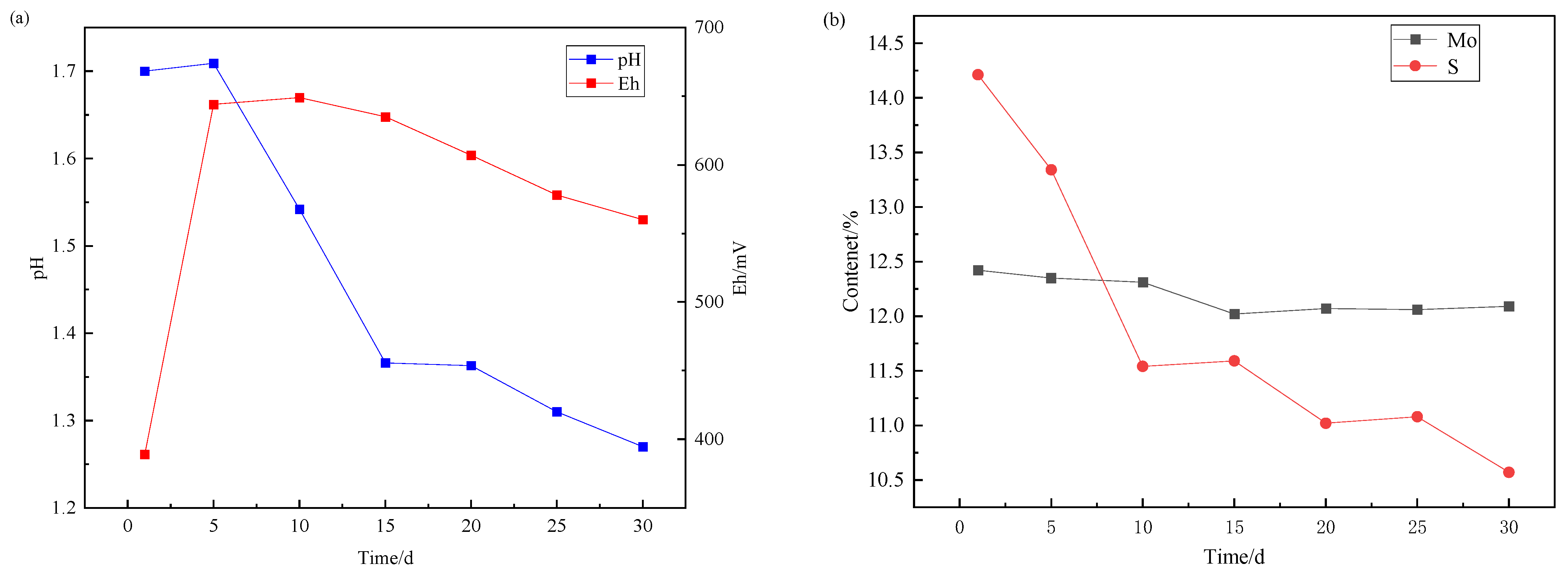 Over a 30-day leaching, samples from one flask were collected at 5-day intervals for vacuum filtration and residue analysis. This methodology enabled phase transformation tracking of molybdenum-bearing species in leached residues across progressive stages. Concurrent monitoring of potential, pH evolution, and aqueous molybdenum/sulfur concentrations was performed throughout the experiment, with comprehensive temporal profiles illustrated in