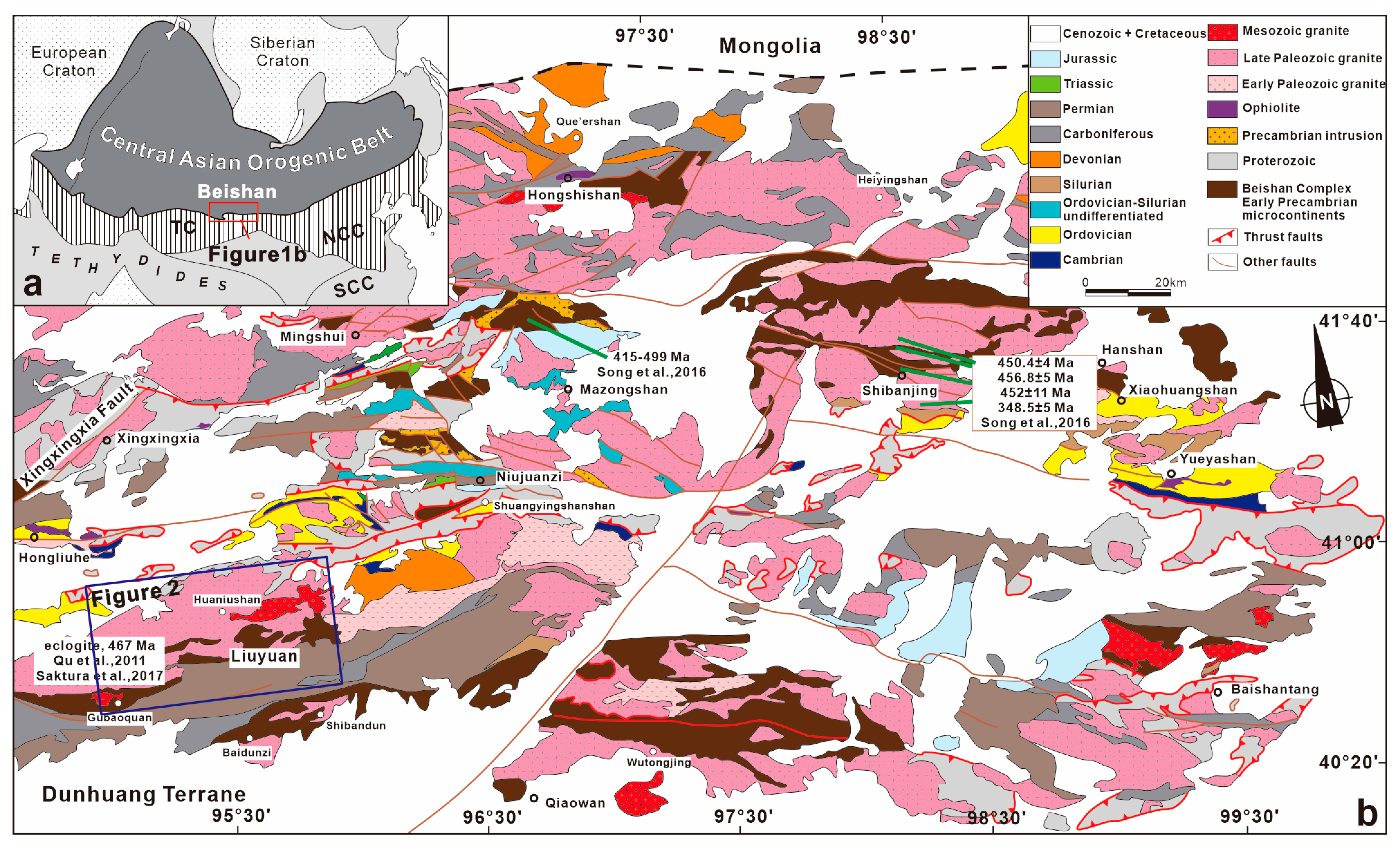 - Zuo, G.C. Tectonic Framework and Metallogenic Regularities of the Beishan Area; Peking University Press: Beijing, China, 1990; (In Chinese with English Abstract). [Google Scholar]
