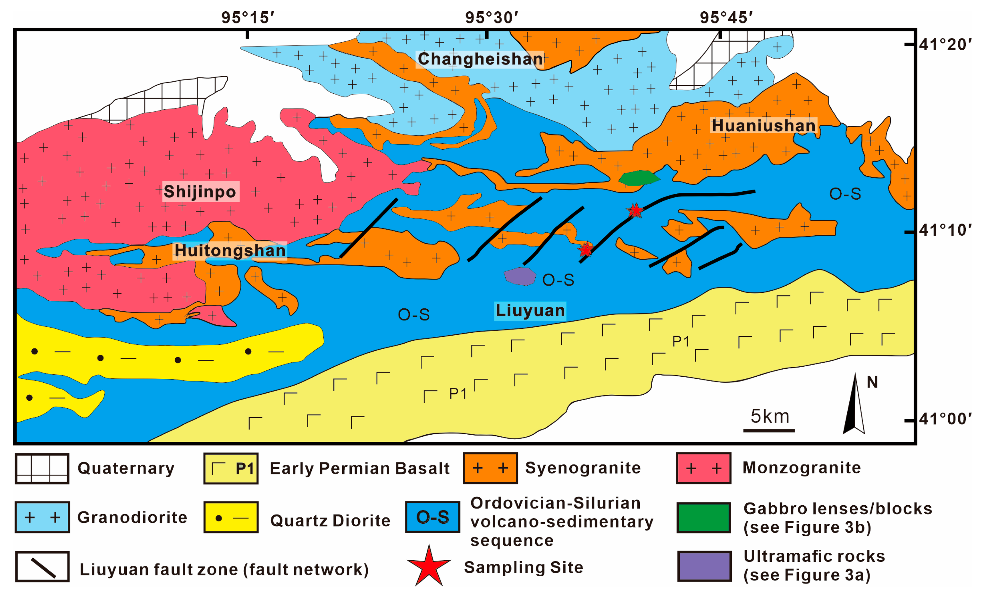 - Wang, Y.U.; Luo, Z.; Santosh, M.; Wang, S.; Wang, N.A. The Liuyuan Volcanic Belt in NW China revisited: Evidence for Permian rifting associated with the assembly of continental blocks in the Central Asian Orogenic Belt. Geol. Mag. 2016, 154, 265–285. [Google Scholar] [CrossRef]