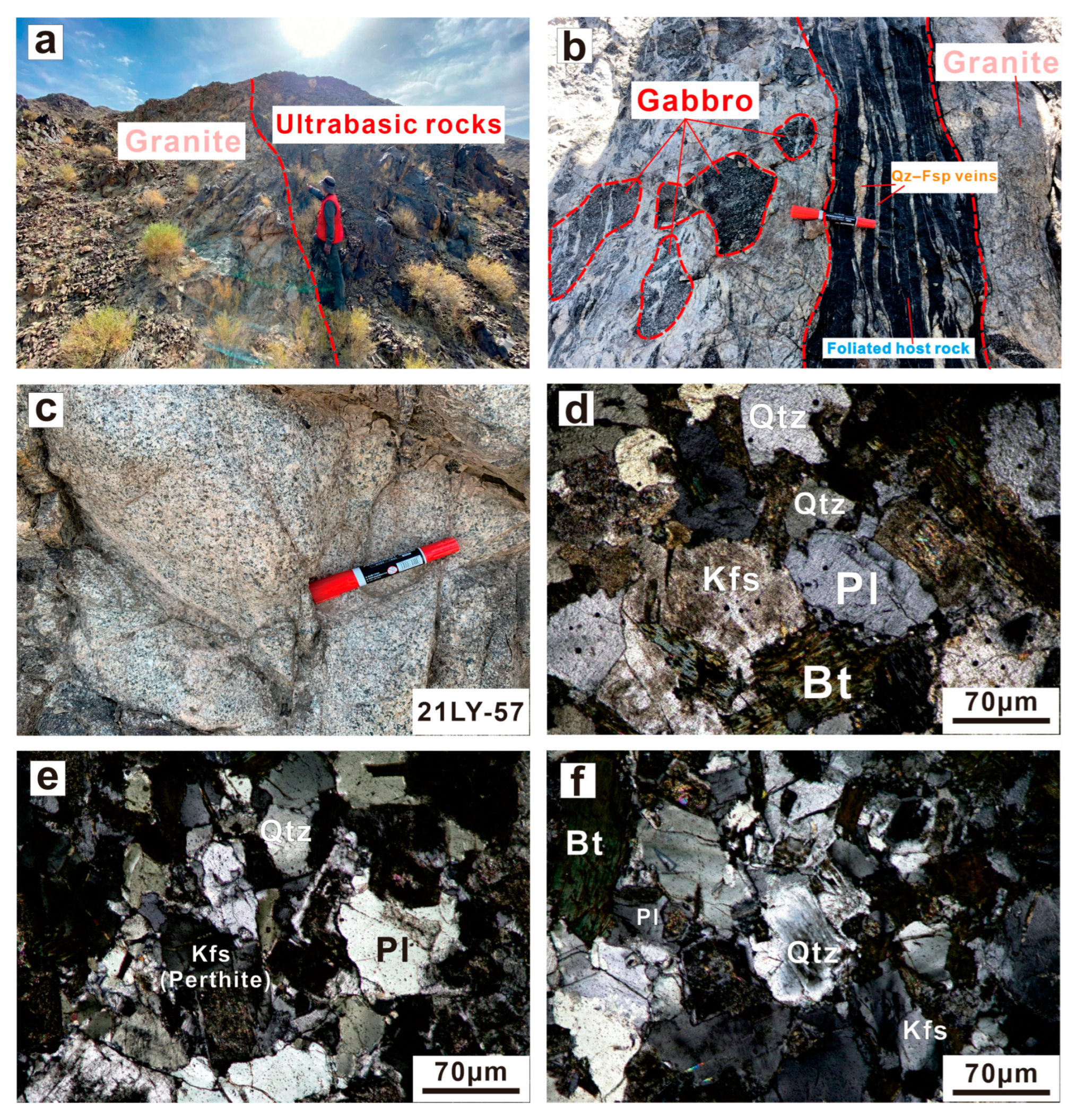 - Zhu, J.; Lv, X.B.; Peng, S.G. U-Pb zircon geochronology, geochemistry and tectonic implications of the early Devonian granitoids in the Liuyuan area, Beishan, NW China. Geosci. J. 2016, 20, 609–625. [Google Scholar] [CrossRef]