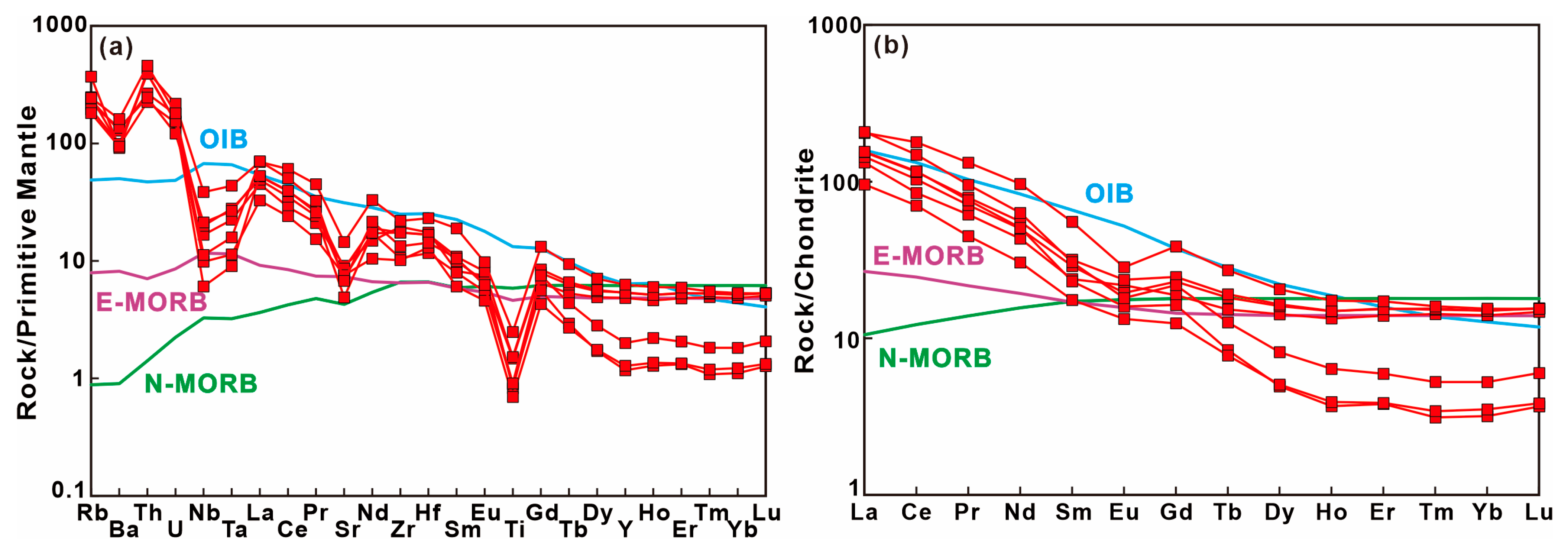 - Sun, S.-S.; McDonough, W. Chemical and isotopic systematics of oceanic basalts: Implications for mantle composition and processes. Geol. Soc. Lond. Spec. Publ. 1989, 42, 313–345. [Google Scholar] [CrossRef]