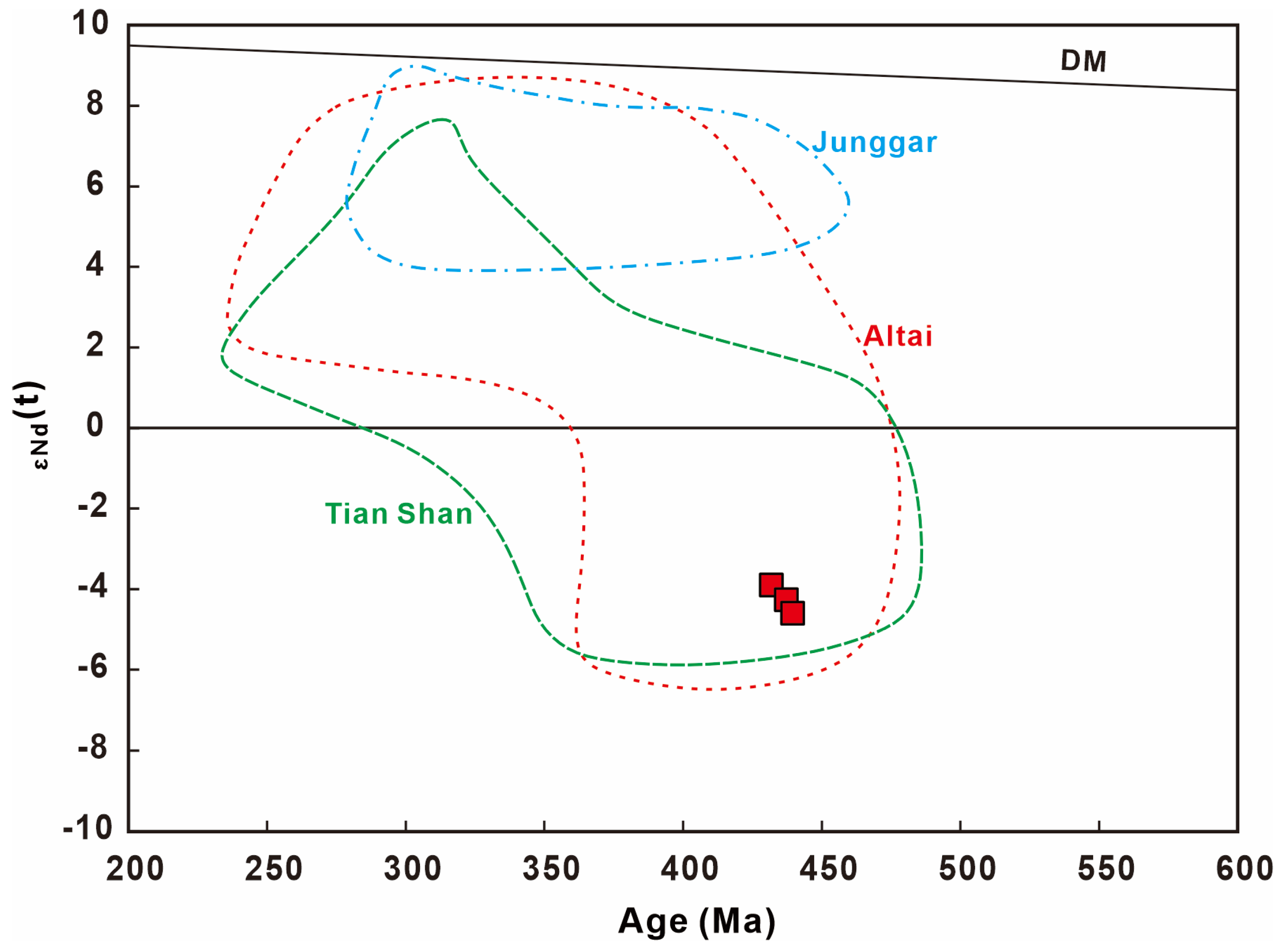 - Tang, G.-J.; Chung, S.-L.; Hawkesworth, C.J.; Cawood, P.A.; Wang, Q.; Wyman, D.A.; Xu, Y.-G.; Zhao, Z.-H. Short episodes of crust generation during protracted accretionary processes: Evidence from Central Asian Orogenic Belt, NW China. Earth Planet. Sci. Lett. 2017, 464, 142–154. [Google Scholar] [CrossRef]