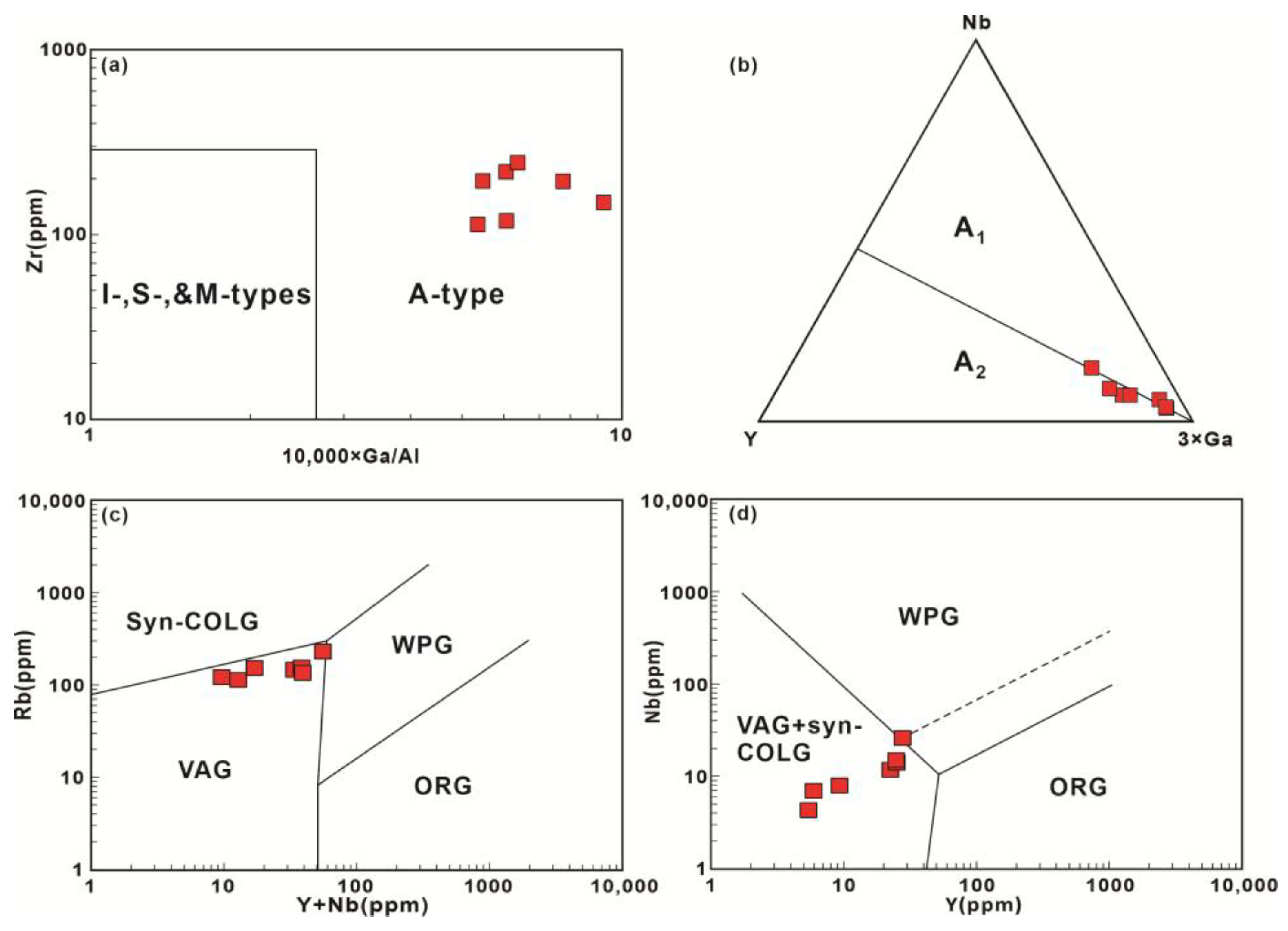 - Eby, G.N. Chemical subdivision of the A-type granitoids:Petrogenetic and tectonic implications. Geology 1992, 20, 641–644. [Google Scholar] [CrossRef]