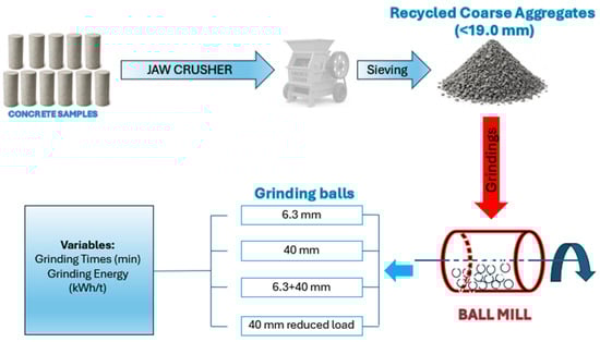 The experimental program aimed to investigate the enrichment of cement paste in the fine fraction of cementitious waste. Exploratory tests were first conducted to obtain an increased mass in the fine fraction below 0.15 mm. Subsequently, various grinding conditions were evaluated, including autogenous grinding (i.e., without steel grinding media), different steel ball diameters, and varying energy inputs. Particle size distribution analysis was determined by sieving. Under the most favorable grinding conditions, the enrichment of the cementitious fraction in the fines was quantified by X-ray fluorescence (XRF), and the Portland cement content was estimated based on the sum of calcium and magnesium oxides and loss on ignition (LOI). XRF was used to measure the percentages of oxides present in the samples, and it was assumed that there was no presence of carbonates in the samples because the concrete was prepared with coarse and sand quartz aggregates. Figure 1 presents an overview of the experimental program.