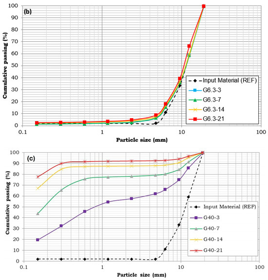 Size distribution curves for: (a) AG, (b) G6.3, and (c) G40 (specific energies up to 21 kWh/t).