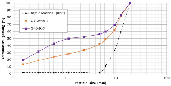 The size analyses of the products generated after the grinding process (AG, G6.3, G40, G6.3+40, and G40-R samples) were performed by dry sieving using square mesh sieves. For the sieve openings 19.0 mm, 12.5 mm, 9.5 mm, 6.3 mm, 4.8 mm and 2.4 mm, a suspended pneumatic vibrating sieve was used. Fractions of 1.2 mm, 0.6 mm, 0.3 mm and 0.15 mm were sieved in a Ro-Tap apparatus (AS 200 TAP, Retsch, Haan, Germany). Both sieving procedures were conducted for 20 min. All size analysis results were compared with the reference sample (feed material).