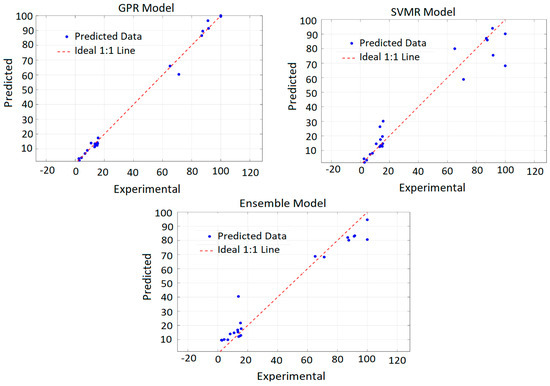 To assess the predictive capability of different data-driven approaches, three regression models, Gaussian Process Regression (GPR), Support Vector Machine Regression (SVMR), and Ensemble Regression (ER), were trained and evaluated using five-fold cross-validation. The comparative results, presented in Table 11, demonstrate that all models effectively captured the nonlinear dependencies between leaching parameters and copper recovery. Among them, the GPR model exhibited the highest predictive accuracy, achieving the lowest RMSE and the highest R2 values.