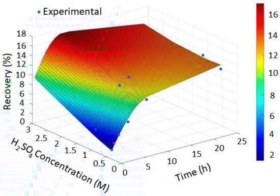 To ensure reliable generalization, cross-validation was employed during training, which also helped mitigate potential overfitting associated with experimental variability. The PRCC-informed GPR model was subsequently applied to predict copper recovery across the entire experimental domain, producing smooth and physically consistent response surfaces that capture the complex nonlinear relationships governing the leaching process. This comprehensive model thus provides a reliable predictive tool for identifying optimal combinations of temperature and leaching duration to maximize copper recovery.