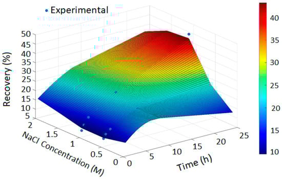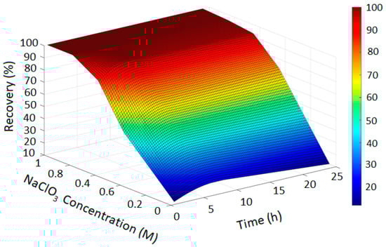 In Figure 2, the GPR surface shows a monotonic increase in recovery with leaching time, reflecting baseline dissolution behavior. In Figure 3, the surface reveals a moderate enhancement in extraction at elevated NaCl levels, consistent with the limited oxidizing capacity of chloride alone. Figure 4 demonstrates a pronounced improvement in recovery induced by hypochlorite, while Figure 5 exhibits near-complete dissolution due to the strong oxidizing effect of chlorate. Taken together, these figures demonstrate that the PRCC-informed GPR model reliably captures the nonlinear leaching behavior under different oxidizing conditions and provides meaningful predictive insight into enhanced dissolution mechanisms.
