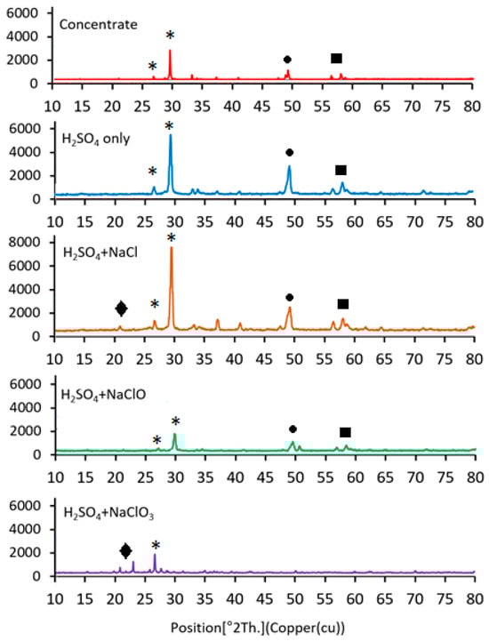 X-ray diffraction (XRD) analyses were performed on both the initial chalcopyrite concentrate and the leach residues to examine phase changes after leaching with different chloride-based additives (Figure 6). The initial concentrate showed characteristic peaks of chalcopyrite and pyrite. After leaching, the intensity of chalcopyrite peaks decreased, indicating partial mineral dissolution.