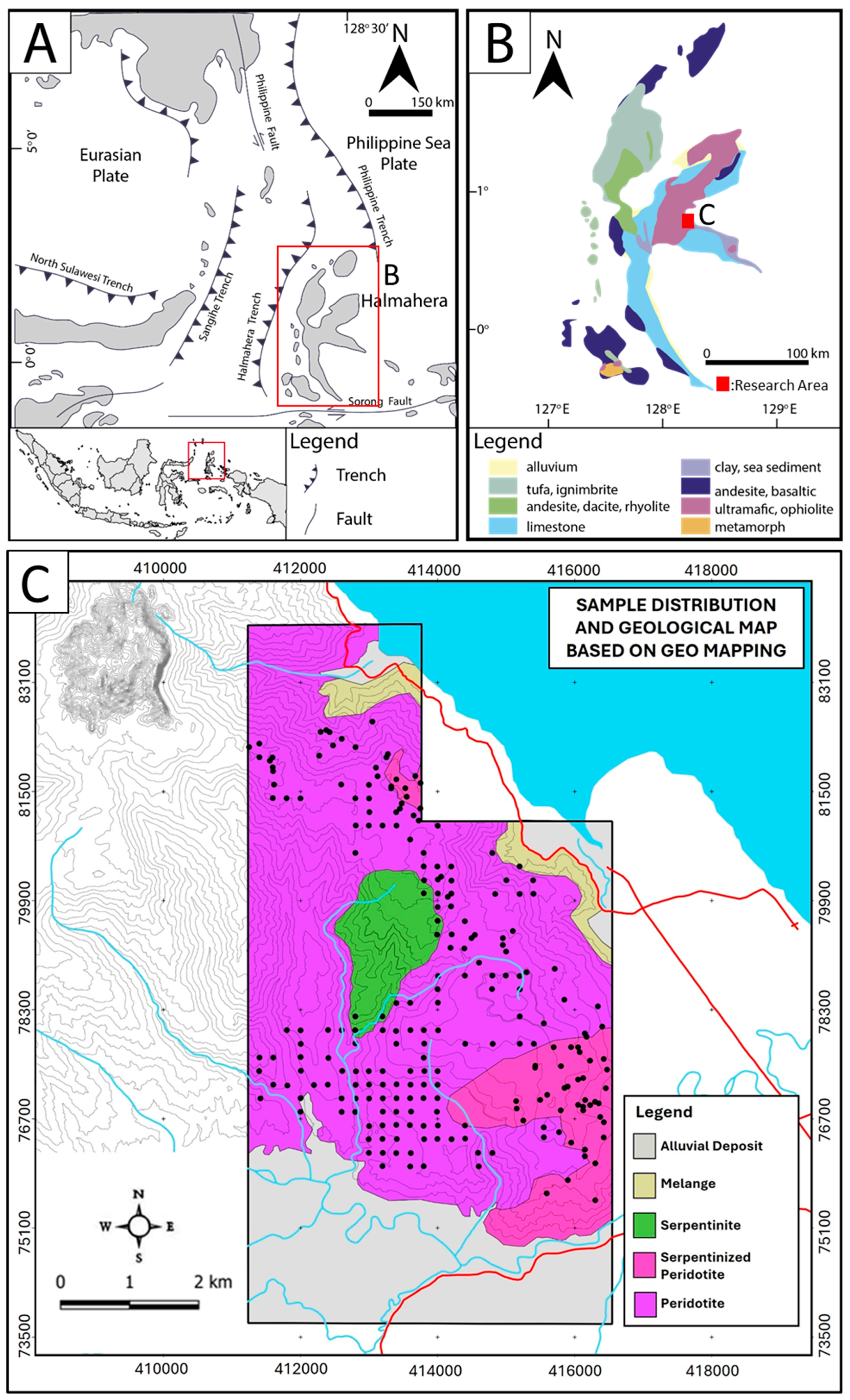- Antam. Annual report—Nickel Laterite Exploration in East Halmahera, North Maluku, Indonesia. Internal report. 2023; (Unpublished manuscript). [Google Scholar]