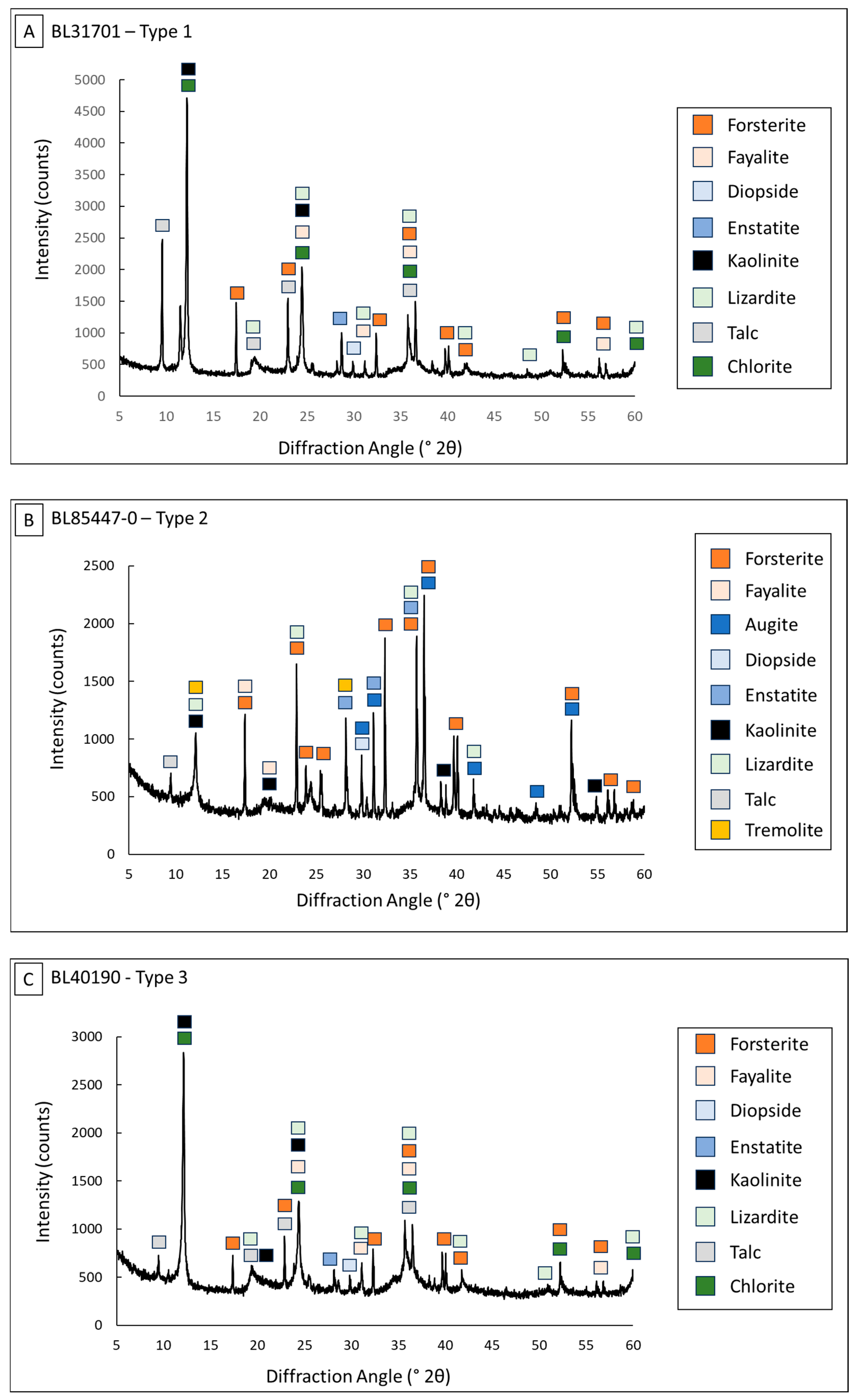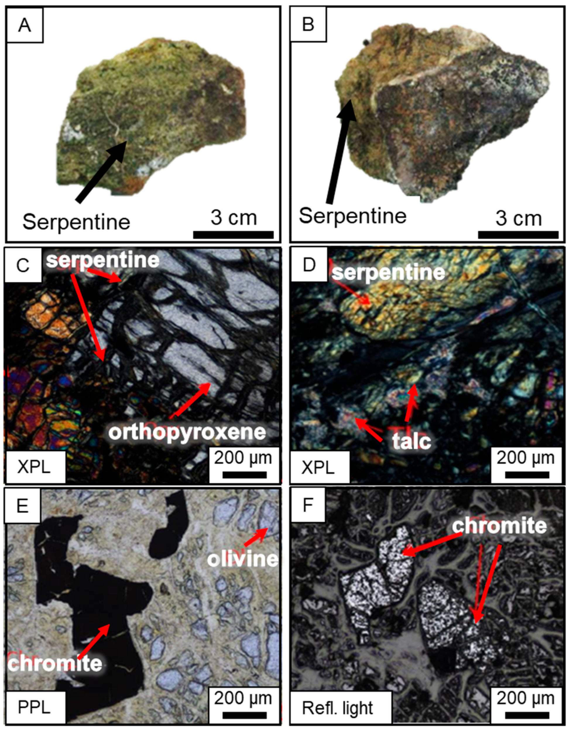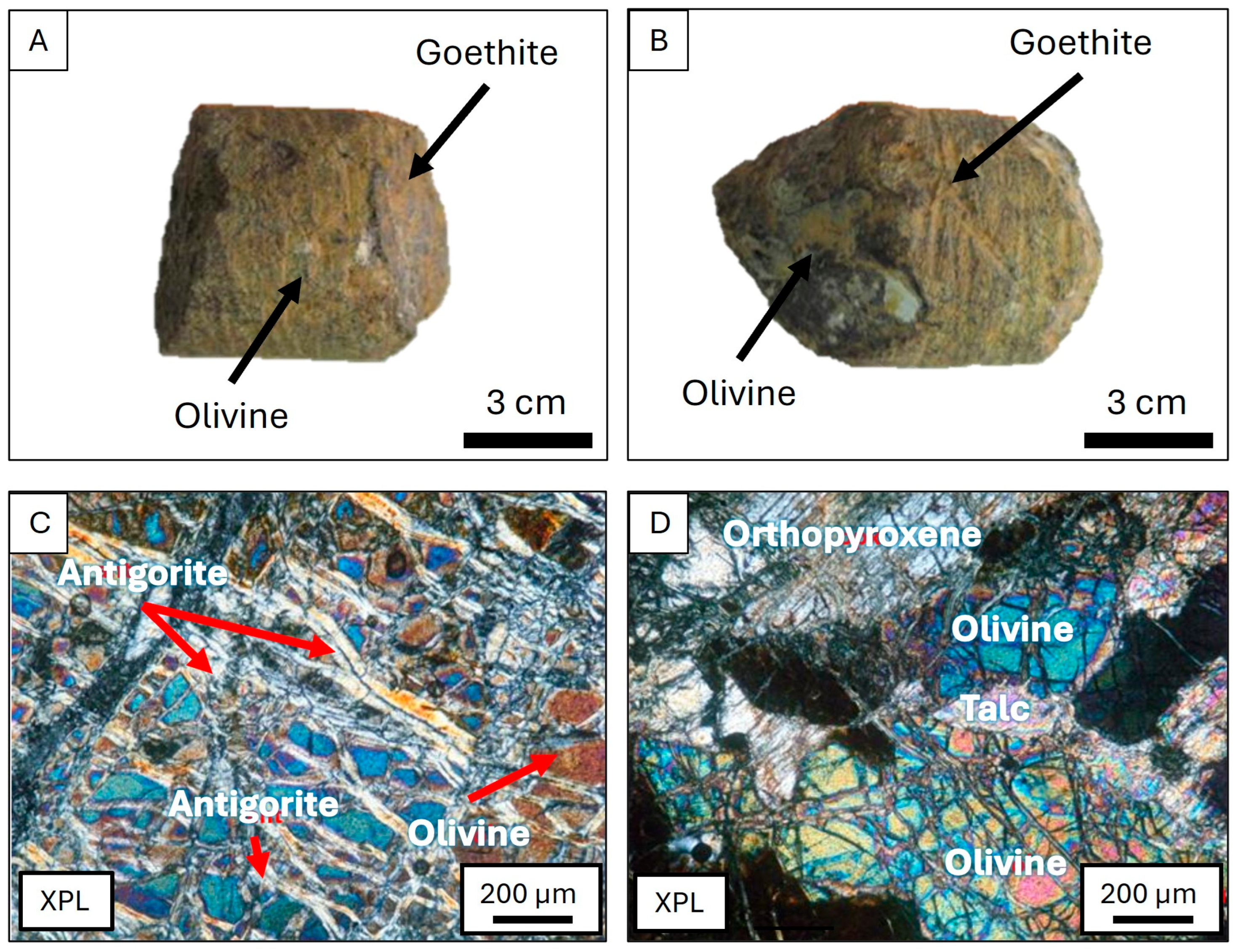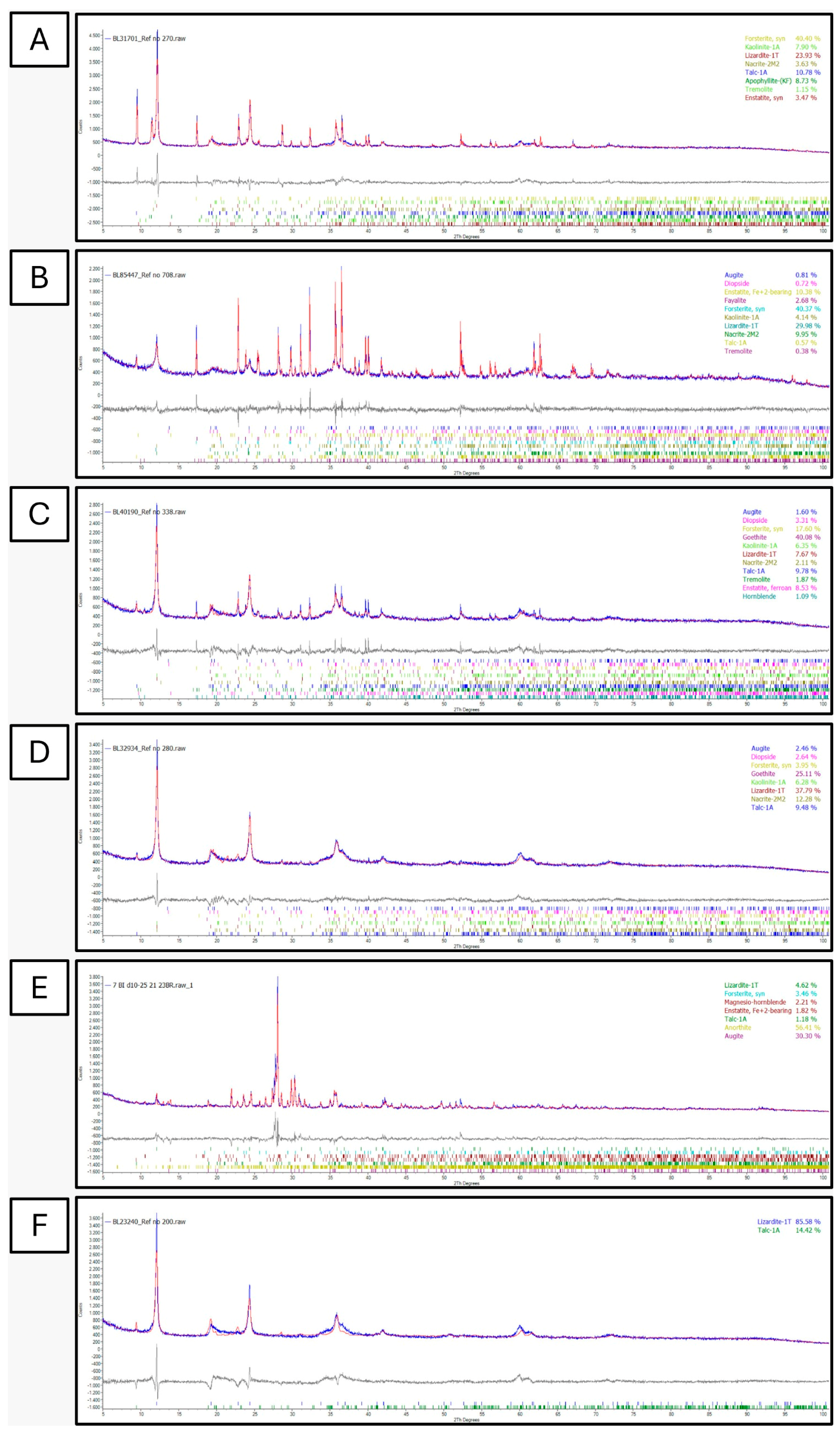 - El Mendili, Y.; Chateigner, D.; Orberger, B.; Gascoin, S.; Bardeau, J.F.; Petit, S.; Duee, C.; Le Guen, M.; Pilliere, H. Combined XRF, XRD, SEM-EDS, and Raman analyses on serpentinized harzburgite (nickel laterite mine, New Caledonia): Implications for exploration and geometallurgy. ACS Earth Space Chem. 2019, 3, 2237–2249. [Google Scholar] [CrossRef]