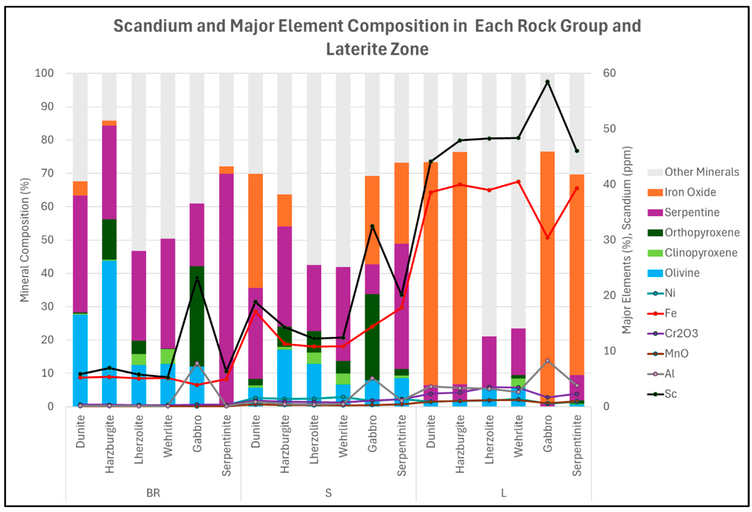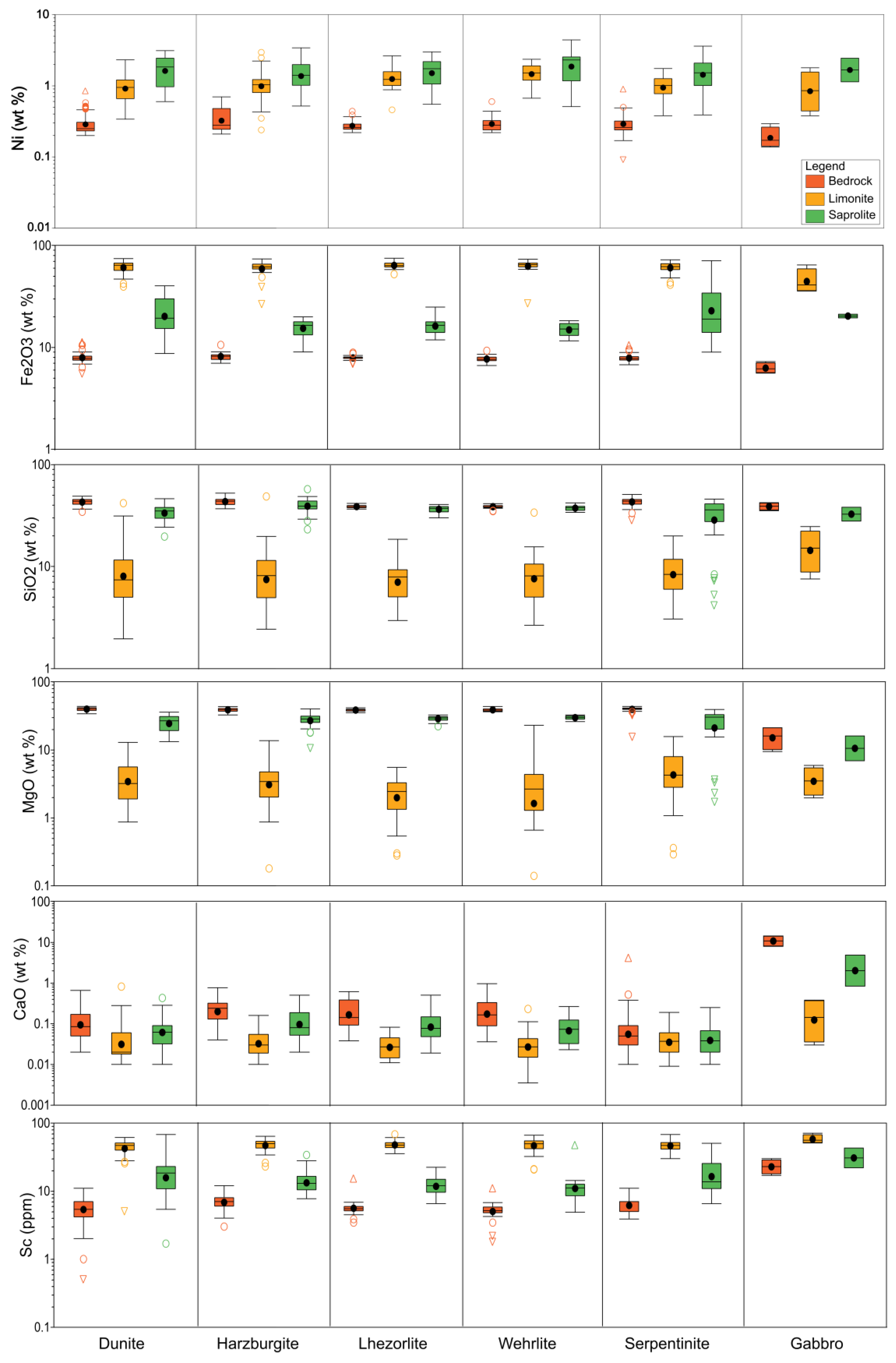 | Scandium (ppm) | Ni (wt%) | Fe2O3 (wt%) | SiO2 (wt%) | MgO (wt%) | CaO (wt%) | |||