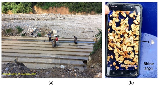 Artisanal mining, gold recovery by gravity directly from the riverbed (a), gold grains recovered during manual panning from the Rhine River (b).