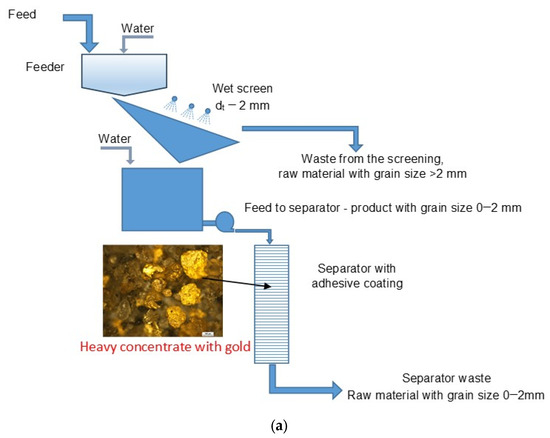 Classic gravity methods have not changed much (Figure 1a,b). The classic pan made of wood is dominant not only in the Far East, where such devices can be found in every home. Other flotation-based methods are practically unattainable due to high investment costs. For the final gold recovery, mercury is used, which, unfortunately, brings environmental pollution and dangerous poisoning associated with it.