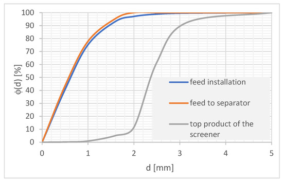 The processing of raw materials in the installation was carried out from 7 a.m. to 12 p.m., i.e., for 5 h. The suspension flow measurements through the separator, which were taken every 60 min, were 17.40; 17.60; 18.44; 16.37; 17.36 m3/h, respectively, giving a volumetric suspension processing of 87.17 m3. The measured suspension density was 1117.3 kg/m3, which means a dry mass content in 1 m3 of suspension of approximately 190.5 kg, which gives a dry mass processing of the raw material by the separator during the test of 16.6 Mg, that is, a separator efficiency of approximately 3.3 Mg/h of dry mass. The specified efficiency of the separator is, of course, lower than that of the installation, which results from the fact that the 0–2 mm grain class is directed to the separator. The amount of material that was processed in the installation is approximately 17.17 Mg (value calculated on the basis of the determined output of the lower screen product that constitutes the feed to the separator).