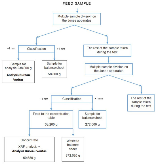 The results of the initial estimated gold evaluation by its concentration on the concentration table indicate its absence in the feed, which is not confirmed by the results obtained microscopically and in the accredited Bureau Veritas laboratory. The gold content in the feed sample obtained in the accredited Bureau Veritas laboratory in Canada indicates its very low content of 4 ppb. The determination performed was carried out for a separated part of the feed sample, i.e., grain class below 1 mm (238.8 g), taking into account the remaining balance part of the sample (58.8 g). The gold content in the feed material is 3.21 ppb (Figure 7).