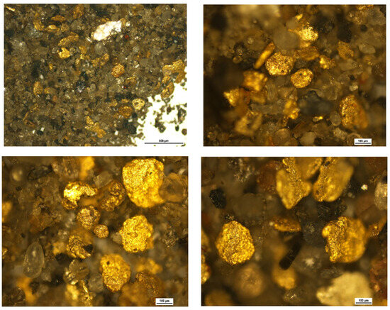 The interest in gold began in the Chalcolithic period, that is, in the time between the Stone and Bronze Ages (about 4000 y. B.C.). Alluvial gold is easily available and has been recovered in Europe since prehistoric times. In Bulgaria, gold panning on the Zlatica River dates from the period of the Roman Empire. Such gold extraction techniques spread rapidly with the development of civilisation (Figure 1). It is estimated that up to several hundred million people are involved in gold mining on a casual and/or professional basis. Artisanal mining is a major concern for governments and environmentalists in many countries, especially when mercury is used to obtain metallic gold. Recently, analysis of the gold market indicated that up to 20% of the metal is obtained through illegal, environmentally destructive exploitation and extraction. It is enough to compare available satellite maps of rainforest areas to determine the scale of the problem. Artisanal miners identify gold macroscopically and use easily recognisable differences in weight to obtain it (Figure 1); however, gold particles below 100 μm in size become invisible and are discarded as waste. The proposed adhesive method allows the extraction of this gold, which in total can reach up to 50% of the resources of a given sedimentary system, and is usually lost. In the case of a primary deposit that contains refractory gold, using this method no longer makes sense. The use of this method to obtain visible gold from primary deposits that require crushing of the feed requires further experimentation. In these deposits, the presence of other minerals such as sulphides [1], tellurides, and carbonates, graphite creates complicated methods to obtain this metal and extends its residence time in the reactor [1,2,3,4,5,6]. Gravity leaching of concentrate using cyanide also causes significant gold loss due to the presence of similar components as in the primary deposits, and only up to 67.07% of gold can be obtained [7,8]. The fine gold adhesion method may prove to be a solution. Research in this area has been carried out in many countries, e.g., Russia [7], Japan [9], Australia [10], Finland, and Germany [11]. The option of chloride–hypochlorite leaching was proposed by the Russian Academy of Sciences [12]. Meanwhile, the primary method of extracting gold from various ores and concentrates is cyanidation [13,14]. Only a few companies, such as Barick, opt for the slower process with thiosulfates [15].