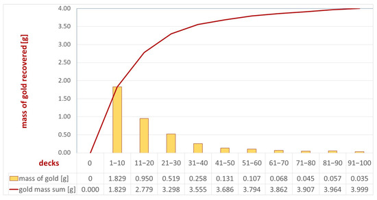 The analysis of the gold recovery efficiency on individual separator decks (the tested separator was built of 100 decks) indicates a decreasing efficiency on subsequent decks. The highest efficiency is achieved in the initial decks; specifically, the first 30 decks accounted for more than 82% (3.298 g) of all gold recovered on the separator. Across the last 10 decks, less than 1% (0.035 g) was recovered, indicating that a further increase in the number of decks may not be economically viable. The number of decks should be determined by determining the durability of the coatings and their efficiency over time. In the event of a decrease in the efficiency of the first decks over time, the efficiency of the separator may be determined by subsequent layers.