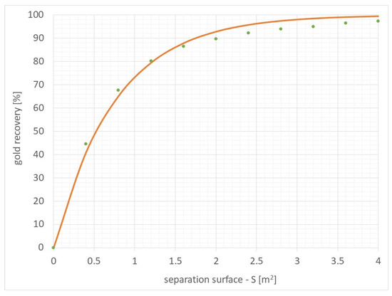 The functional relationship of gold recovery as a function of the active surface of the separator (gold recovery = 100 × (1 − Exp(−1.320152 × separation surface [m2])) along with the measured points.