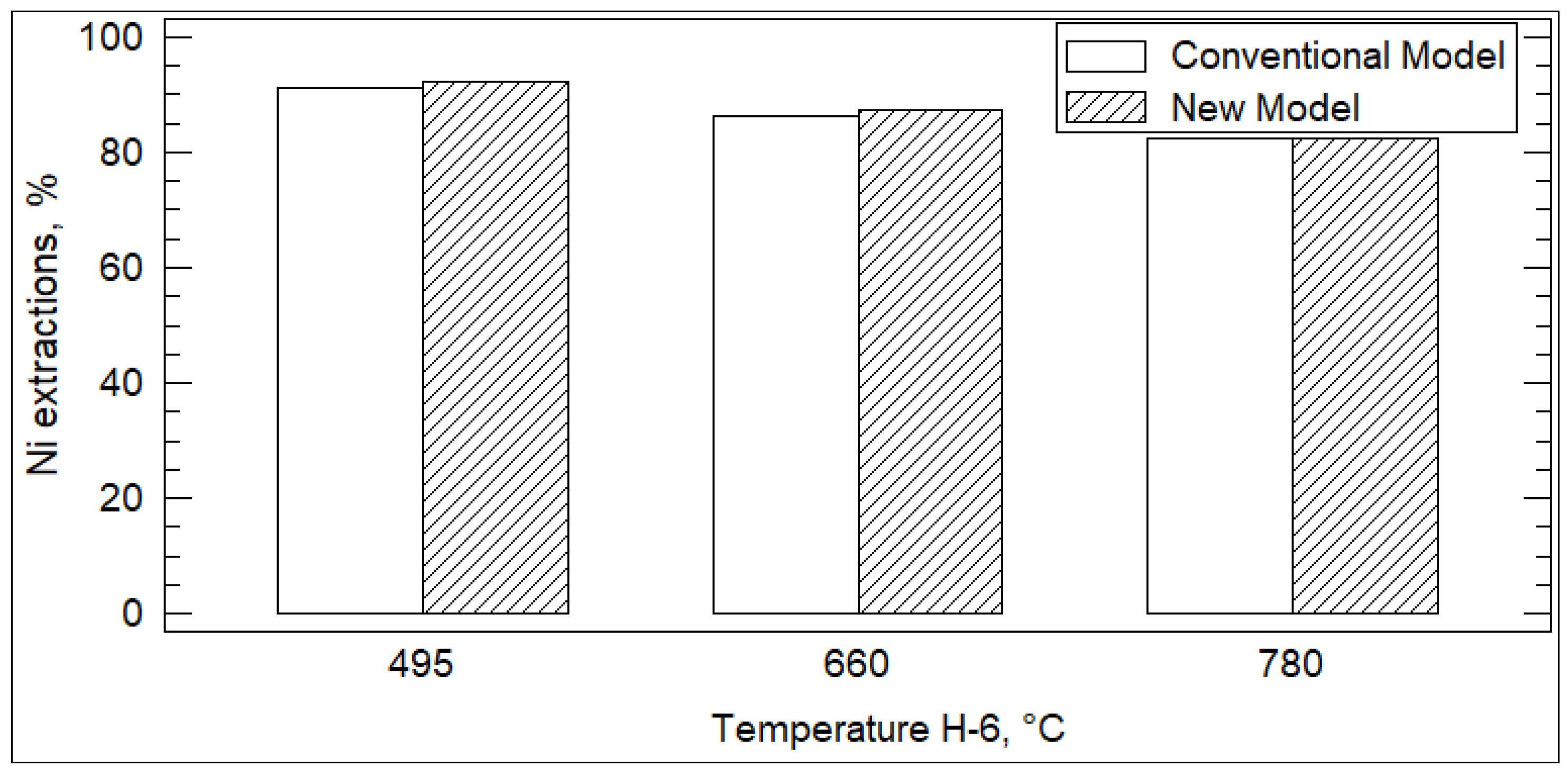 - Substitute the unconverted fraction of nickel in Equation (1) by incorporating the kinetic model based on TH-6, based on the experiences obtained by Angulo et al. [26]; see Equations (7) and (8).where:t is residence time, min.
