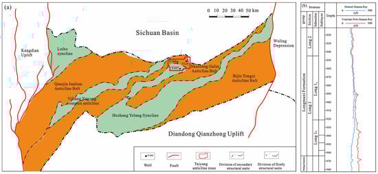 The Zhaotong Demonstration Zone is located in the Wumeng Mountain area, tectonically situated in the southwestern part of the Upper Yangtze Block. It primarily belongs to the complex residual structural depression zone outside the Sichuan Basin (the Dianqianbei Depression). In the north, it spans the low-steep fold belt of the southern marginal platform depression of the Sichuan Basin, while in the south, it borders the Dianqianbei Uplift. The Taiyang shallow shale gas field lies in the northeastern part of the demonstration zone [13,14,15] [Figure 1a]. The Zhaotong exploration area has undergone multiple phases of intraplate deformation and superposition due to orogenic movements since the Caledonian period, resulting in a structural deformation pattern dominated by compartmentalized fold belts, combined with thrust and strike-slip movements. Large faults, fracture zones, and through-going faults are well-developed. Shale formations in anticlinal zones have been largely eroded, leaving shale gas reservoirs preserved only in synclinal areas. The preservation conditions here are generally poorer compared to the more stable Sichuan Basin region to the north, forming shale gas geological characteristics typical of complex structural areas, including “strong reformation, over-maturity, and shear stress,” as well as the unique conditions of mountain shale gas [16,17]. Regional sedimentary and structural studies in South China indicate that during the Middle to Late Ordovician, a hard collision occurred between the Cathaysia Block and the Yangtze Block, forming an orogenic belt in the Xuefeng-Jiangnan region that continuously thrust northwestward. Influenced by the Kangdian Paleo-uplift to the west and the central Sichuan uplift to the northwest, a foreland basin belt of the Yangtze River developed during the Late Ordovician to Early Silurian in the southern Sichuan-Chongqing, northern Guizhou, and western Hunan-Hubei regions [18,19].