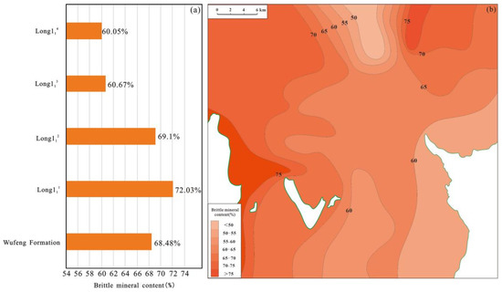 Vertical and Planar Distribution Characteristics of Brittle Mineral Content in the Wufeng Formation to Long11 Member of the Taiyang Shale Gas Field. (a) Vertical distribution diagram of brittle mineral content from the Wufeng Formation to the Long11 Member in the Taiyang Shale Gas Field; (b) Planar distribution map of brittle mineral content from the Wufeng Formation to the Long11 Member in the Taiyang Shale Gas Field.