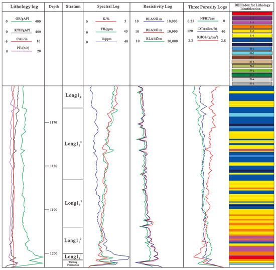 The DEI obtained through dual-energy computed tomography (CT) scanning analysis of full-diameter cores can accurately identify lithofacies. Therefore, using the core DEI as a calibration standard, a computational model between the DEI and various logging curves is established to calculate a continuous DEI curve. This serves as the basis for automatically identifying shale reservoir lithofacies. Figure 3 illustrates the automatic identification of lithofacies in the shale gas reservoir of Well Y104 using the DEI. The lithology log in track 7 includes four major categories subdivided into 17 minor lithology types: ① biogenic siliceous shale (subdivided into I-1, I-2, I-3); ② argillaceous shale (subdivided into II-1, II-2, II-3, II-4, II-5); ③ calcareous shale (subdivided into III-1, III-2, III-3, III-4); and ④ limestone, among others (subdivided into IV-1, IV-2, IV-3, IV-4, IV-5).