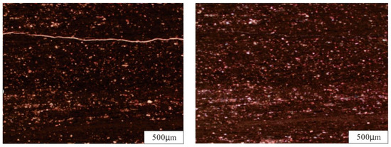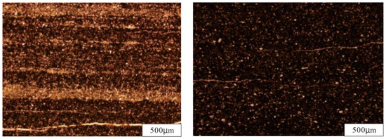 Within biogenic siliceous shale, the bright laminations correspond to intervals densely populated by diatoms, calcareous algae, and radiolarians, typically ranging from 0.1 to 0.3 mm in thickness. Sublaminations are composed of multiple bright laminations, representing zones of relatively concentrated development of diatoms, calcareous algae, and radiolarians. The dark laminations represent intervals where these organisms are relatively less developed (Figure 5 and Figure 6).