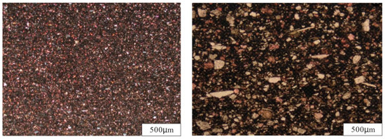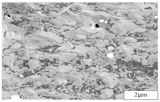 The siliceous shale (dark laminations) is dominated by black, parallel laminations, exhibiting a thinly layered structure. The mineral composition is primarily quartz, followed by illitic clay minerals. Microscopic observation reveals irregular, angular to sub-angular detrital quartz grains (10–30 μm in diameter) in a dispersed form. In addition to the main minerals, clay minerals appear cryptocrystalline and flaky, locally intermixed with black bitumen in a disseminated form within the minerals and clay matrix. Authigenic pyrite is also common, often occurring as framboidal aggregates within the siliceous shale. Sometimes, pyrite forms distinct bands, primarily related to the strongly reducing conditions of the deep-water facies environment [26,27] (Figure 7).