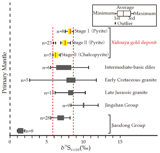 The sulfur isotope compositions of pyrite from the Xidouya gold deposit as well as those from other geological units in Jiaodong. The Intermediate–basic Diles complex δ34S data from [42]. The Early Cretaceous granitic complex δ34S data from [43]. The Late Jurassic granitic complex δ34S data from [43,44]. The Jingshan group δ34S data from [45]. The Jiaodong group δ34S data from [43,46,47,48].