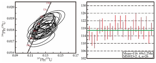 Monazite grains recovered from the Stage II quartz–pyrite veins are dark gray and exhibit euhedral to subhedral morphologies, with grain sizes typically ranging from 50 to 100 μm (Figure 5). Th content is an effective geochemical indicator for distinguishing monazite genetic types: hydrothermal monazite typically has low U and Th content, with highly variable Th/U ratios in low-temperature metamorphic and hydrothermal monazite; high-grade metamorphic and magmatic monazite have high Th contents, usually greater than 3% [49,50]. Backscattered electron (BSE) imaging reveals that these grains possess a homogeneous internal texture and lack obvious compositional zoning—features that are consistent with a hydrothermal rather than a magmatic or high-grade metamorphic origin (Figure 5). Furthermore, the maximum Th content is approximately 2.3%, which provides additional support for a hydrothermal genesis (Table 3). Notably, two monazite grains yielded older 206Pb/238U ages of 132.7 Ma and 123.4 Ma (Table 3). Based on their distinct textural positioning and older isotopic signatures, these grains are interpreted as inherited relicts derived from the host wall-rock; consequently, they were excluded from the final age calculation. The remaining 26 analyses plot on or closely along the concordia line, yielding a weighted mean 206Pb/238U age of 116.69 ± 1.2 Ma (MSWD = 2.4) (Figure 6). Given their paragenetic association with the primary sulfide minerals and their geochemical characteristics, this date is interpreted to represent the timing of the syn-ore hydrothermal event.