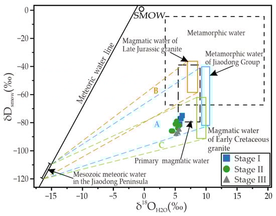 Isotopic compositions of oxygen and hydrogen in the Xidouya gold deposit (modified after [67,68]). Regions A, B, and C represent the mixing areas of meteoric water with metamorphic water of the Jiaodong Group, magmatic water of Late Jurassic granite, and magmatic water of Early Cretaceous granite, respectively.