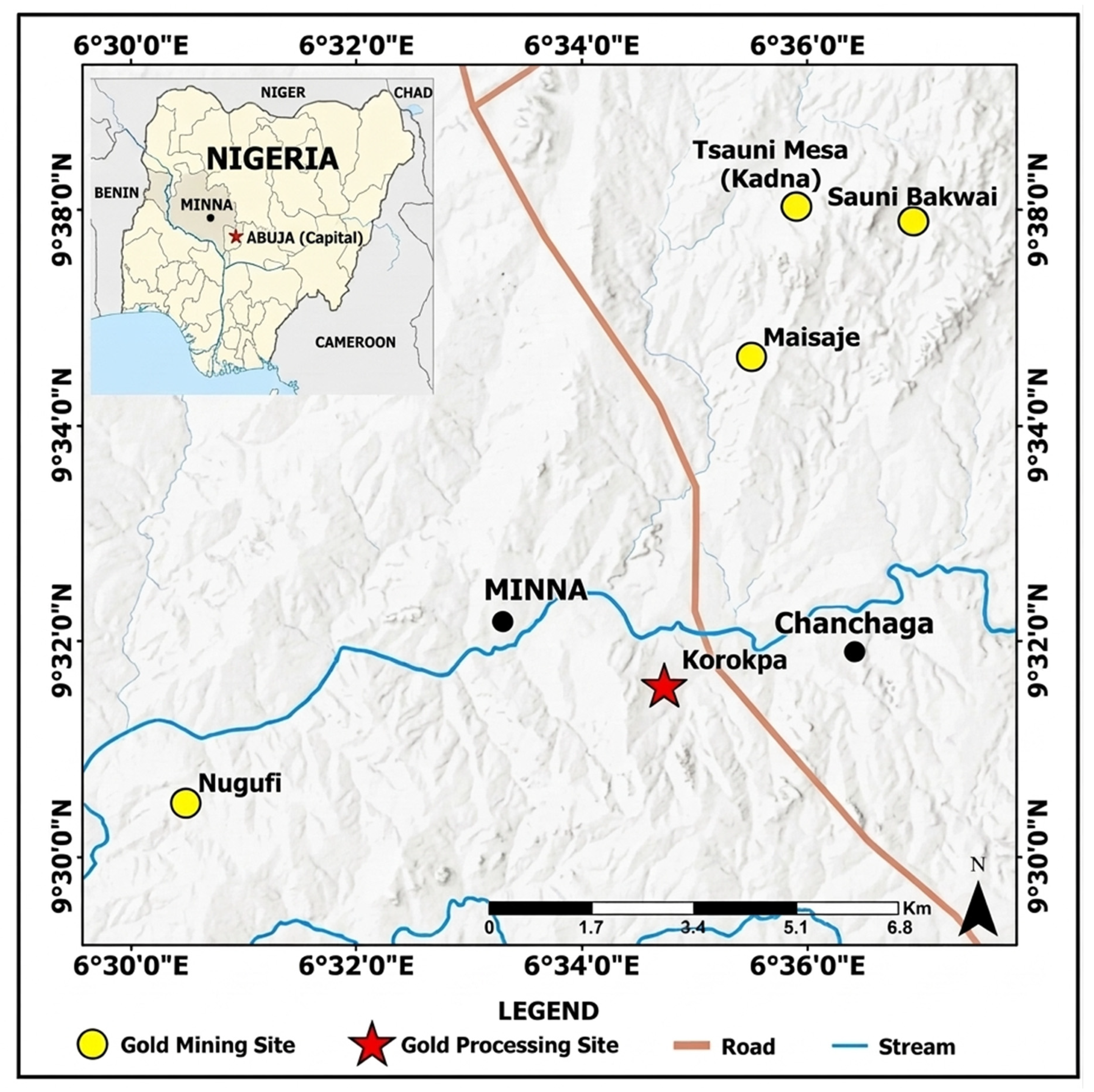 The Korokpa mining site in northwestern Nigeria is 154 km from the Nigerian capital, Abuja (FCT). The mining operations are located 12 km from the town of Minna, the capital city of Niger State. The region has an estimated 4000 miners who manually excavate mineralised quartz veins to extract ore for transport to one of the 17 artisanal gold processing units in the Korokpa community (Figure 1).