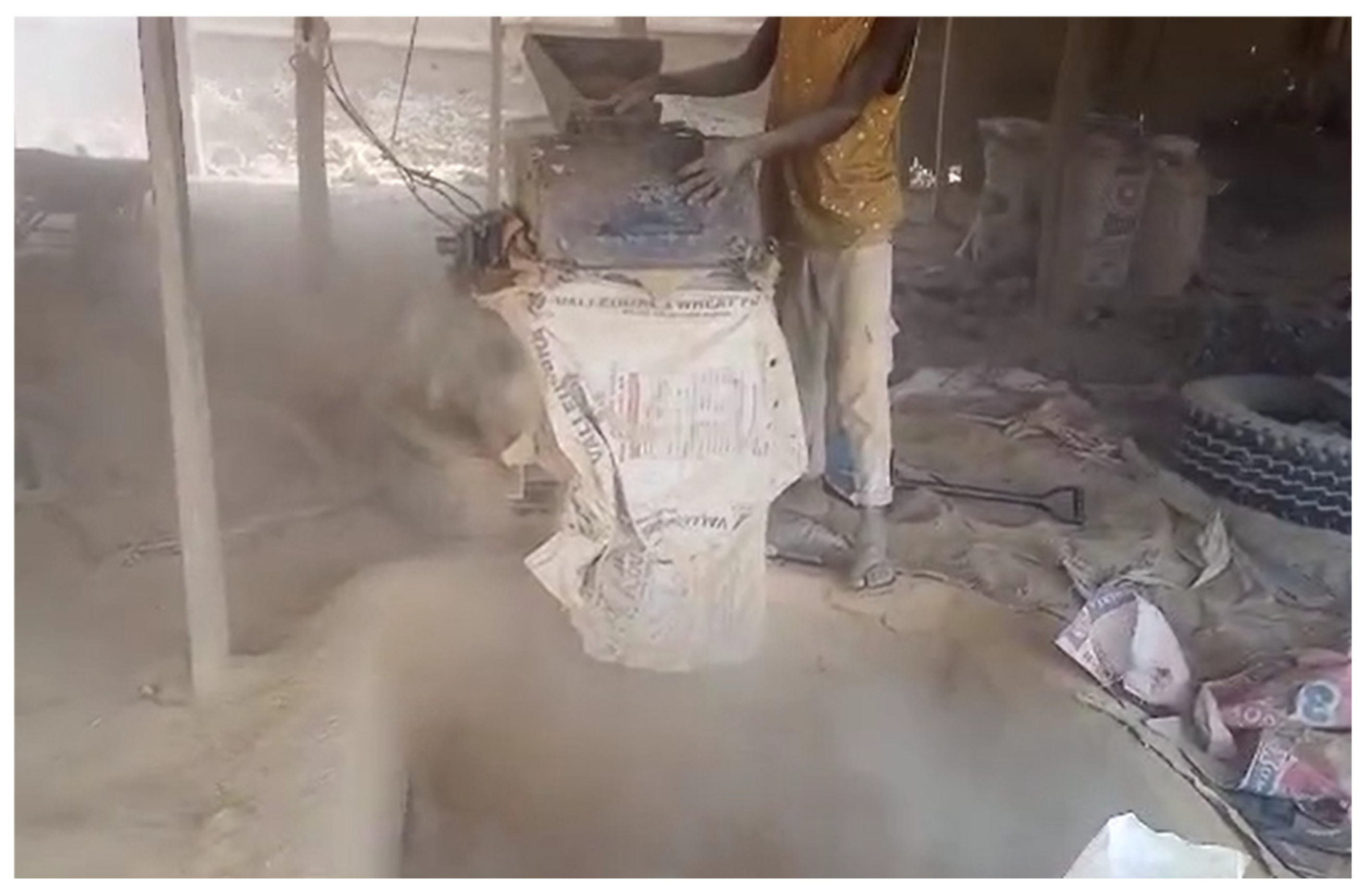 The entire comminution process is conducted under dry conditions as a way for miners and centres’ owners to control the number of bags processed. As shown in Figure 4, there are no dust control or safety measures, making the processing site a major source of silica and heavy-metal-laden dust that has caused severe lead pollution [6,10].