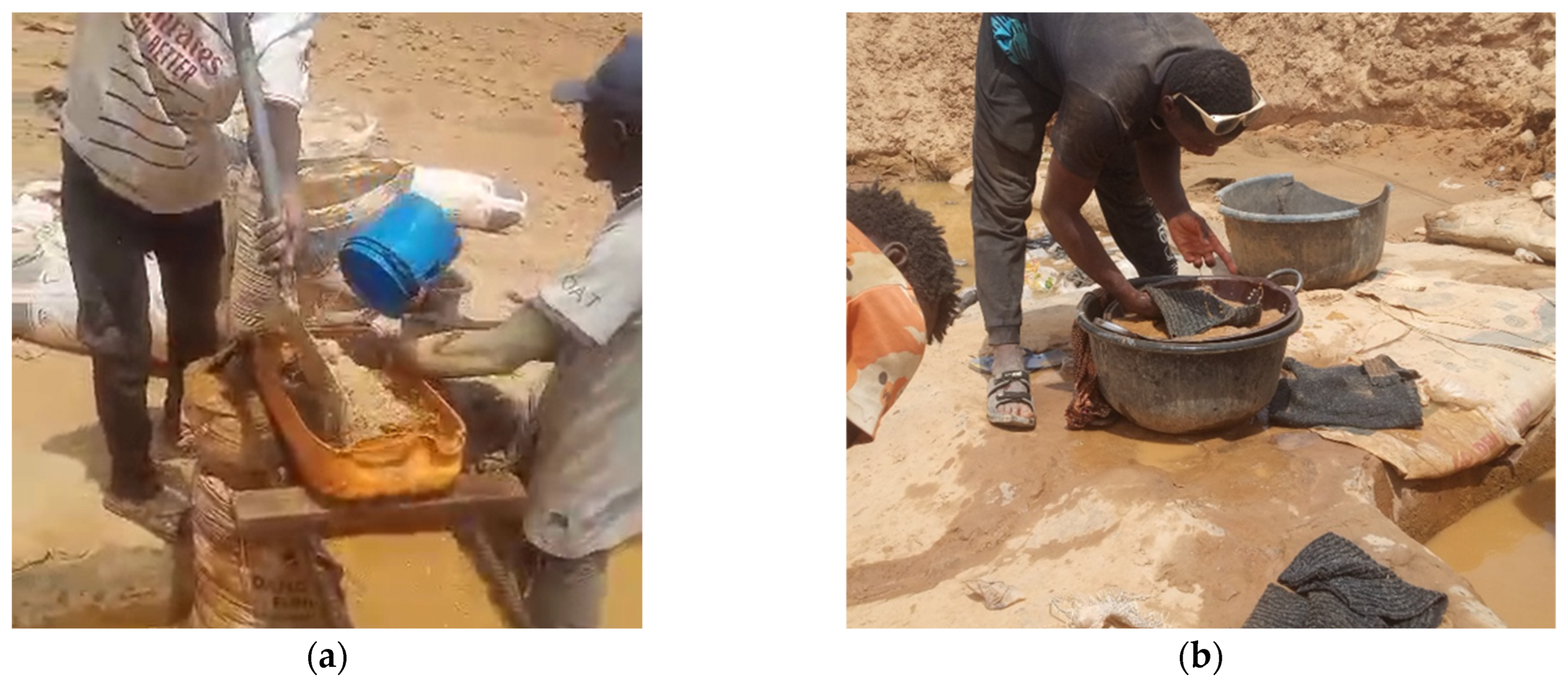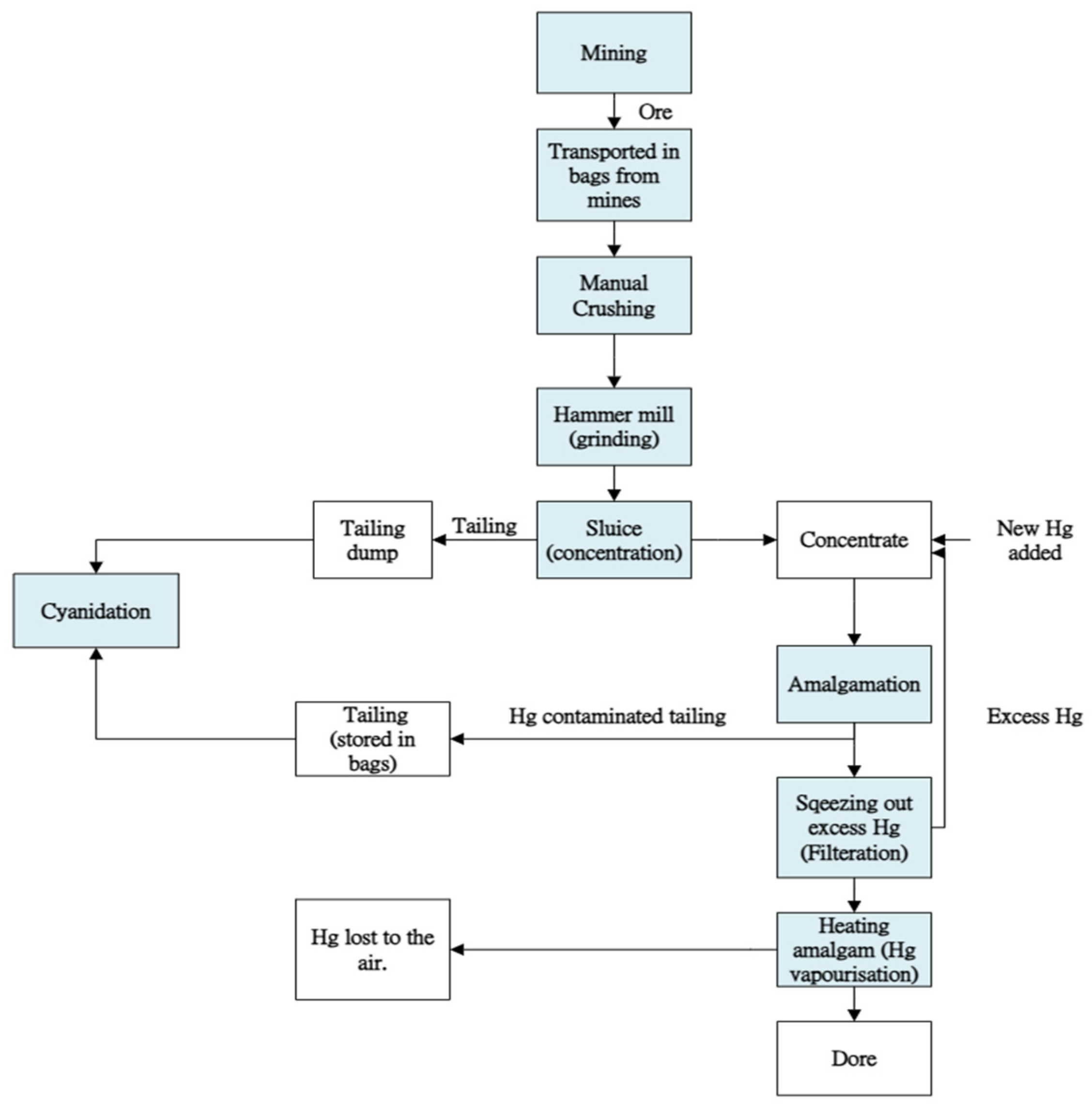 29. Yoshimura, A.; Suemasu, K.; Veiga, M.M. Estimation of Mercury Losses and Gold Production by Artisanal and Small-Scale Gold Mining (ASGM). J. Sustain. Metall. 2021, 7, 1045–1059. [Google Scholar] [CrossRef]
