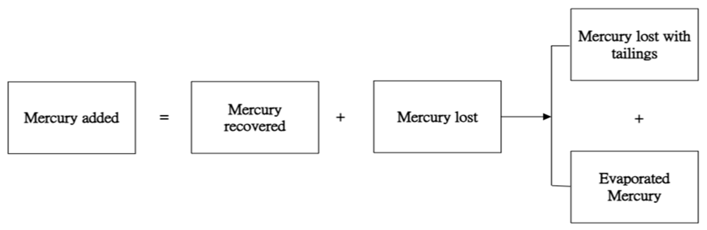 The Hg balance principle follows that the Hg added equals the Hg recovered by filtration plus the Hg lost to tailings and volatilisation, as shown in Figure 7. This process was repeated eighteen times with different amalgamation operations in the study area. The approach assumes that all Hg not accounted for in the recovered liquid phase or volatilised gas phase remains within the tailing stream. It is possible that residual Hg may remain in the doré due to the relatively low temperatures a bonfire can reach.