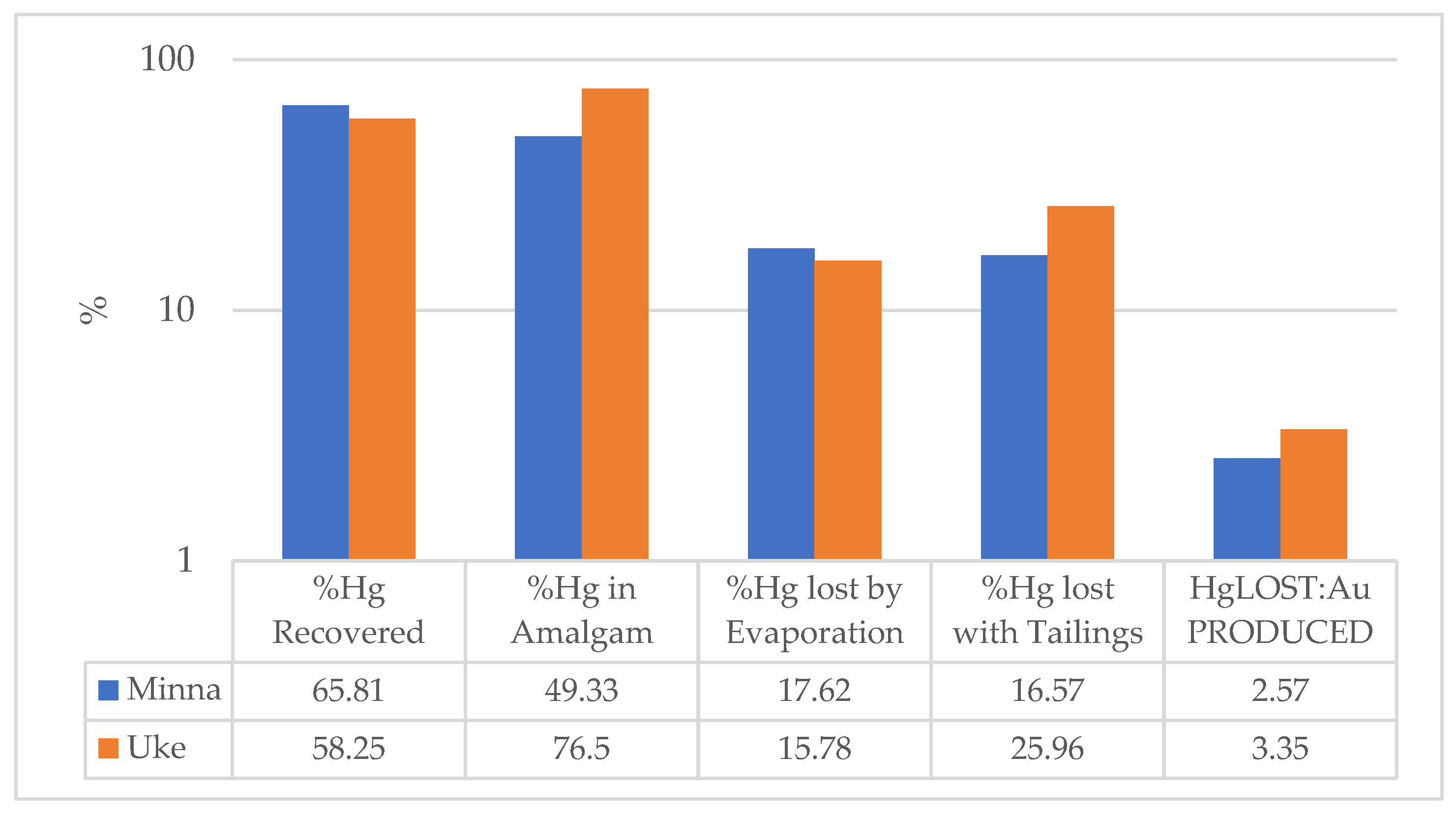 Velásquez-López et al. [30] studied Hg balance across processing centres in Portovelo-Zaruma (Ecuador). They showed that nearly 30% and 15% of the Hg added into whole-ore amalgamation was lost to air and tailings, respectively. In contrast, they found that the amalgamation of gravity concentrate resulted in lower Hg releases to land and water, with 1.4% lost to tailings; however, a high emission of approximately 40% still occurred to the atmosphere when retorts are not used. The Hg lost-to-Au produced ratio for the whole ore and the gravity concentrate amalgamation was found to be 12.0 and 1.06, respectively [30].