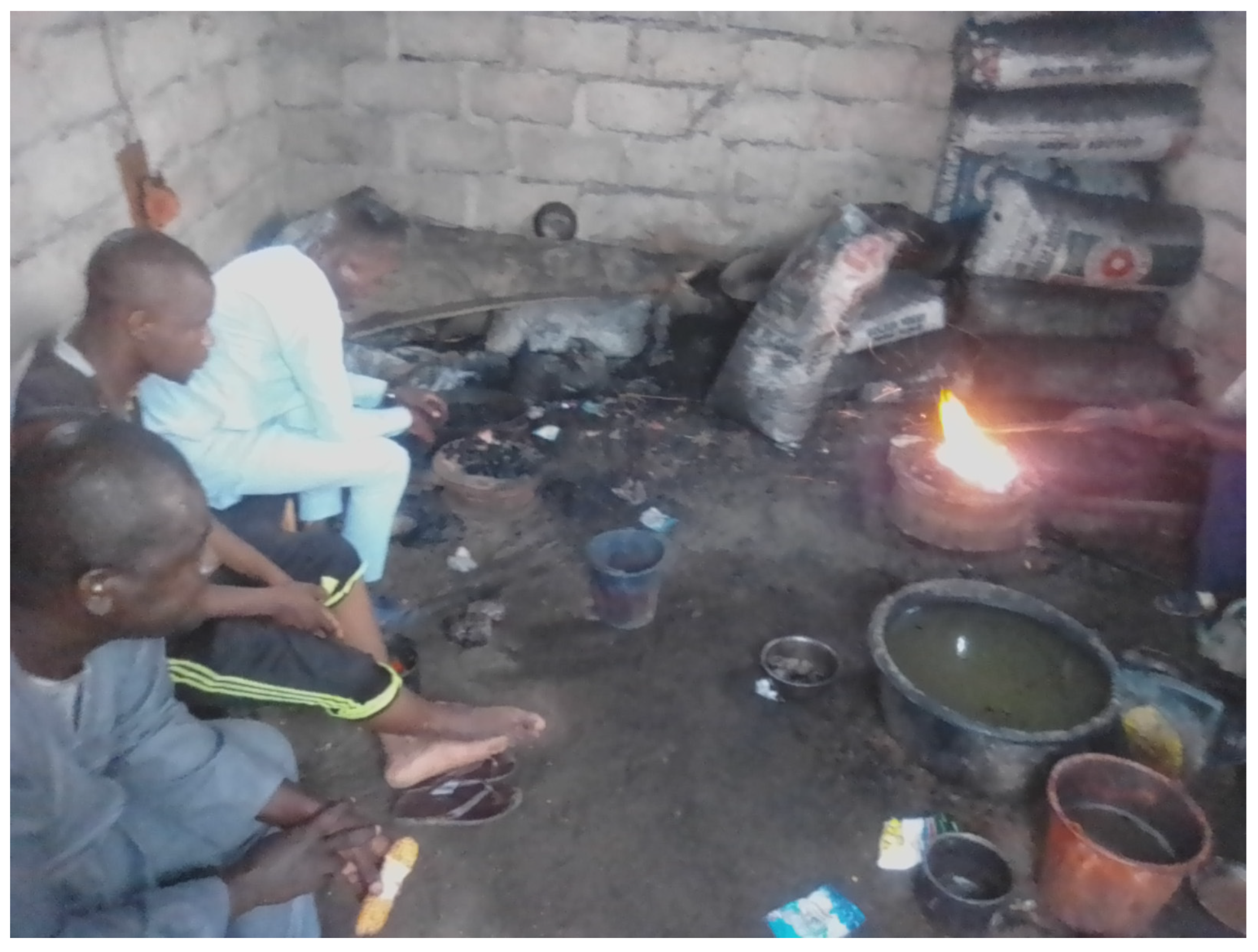 In Nigeria, the gold buyers typically melt the doré at their shops, often located near marketplaces and residential areas, to remove residual mercury. A study conducted by Cordy et al. [27] found that Hg emissions are high across gold-buying shops, and reported that Hg concentration in the air around the shops exceeds the World Health Organisation (WHO)’s tolerable limit of 0.2 µg/m3, and in many cases, is greater than the WHO’s hazard level of 1 µg/m3. Gold-buying shop owners across Minna also neglect to implement measures to contain Hg emissions or to protect themselves from mercury contamination (Figure 9). Without the use of equipment such as condensers, retorts, fume hoods, and filters by these shops to trap Hg vapour, people in these communities would continue to be exposed to Hg. It was evident that the regulation of this practice is virtually non-existent. The harmful effects of Hg exposure on people’s health are well-documented, as it has been linked to impaired cognitive function, neurological damage, kidney failure, memory loss, tremor, and even death, referred to as Minimata Disease [4,28].