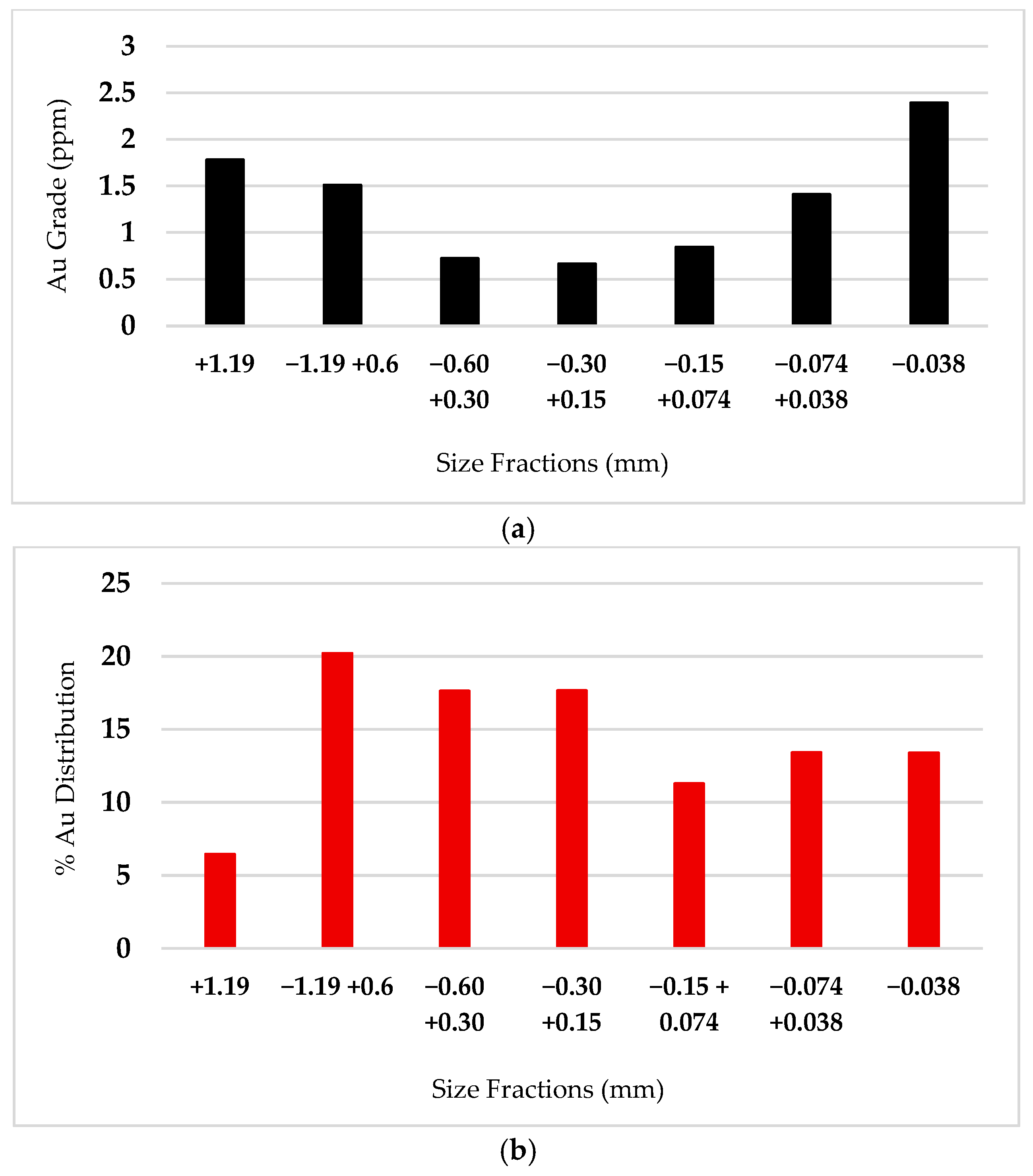 Figure 10. Grain-size distribution analysis of tailings sample from Korokpa: (a) Au grades, (b) % Au distribution.