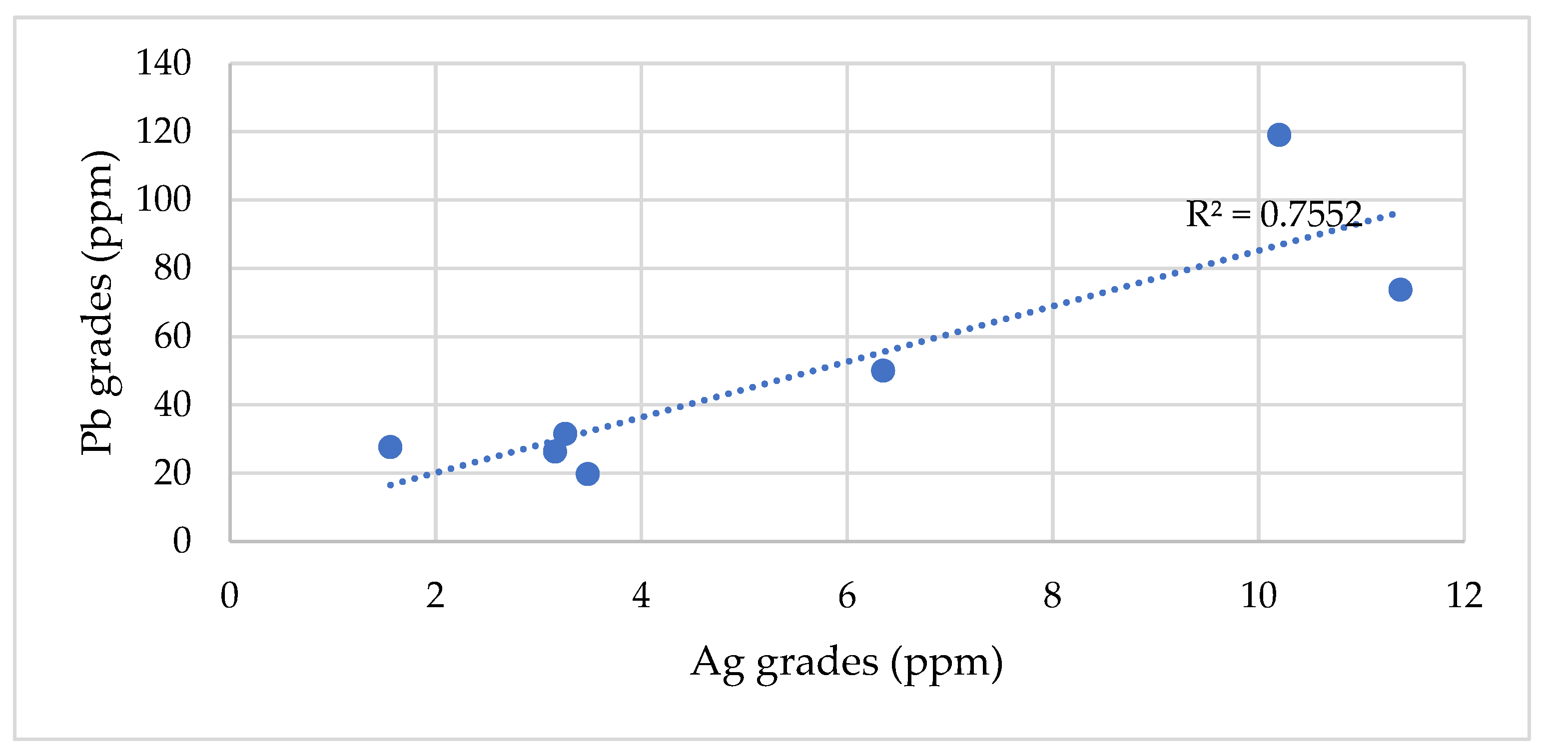 Table 3 presents the average grades of heavy-mineral elements in the tailing sample, along with the elements’ grades in the respective screened fractions, indicating a small presence of sulphides in the gravity-separation tailings (305 ppm sulphur). Correlation analysis of grain-size fraction grades indicated the presence of sulphide minerals; for example, sulphur showed strong positive correlations with lead (r = 0.72), zinc (r = 0.62), and copper (r = 0.62). The strong positive correlation between lead and silver (r = 0.87) suggests that galena (PbS) is likely the principal silver-bearing mineral, with a secondary association in other sulphides. In contrast, the weak correlations between gold and silver (r = 0.40) and between gold and sulphur (r = 0.43) may indicate a decoupling in the emplacement of the two metals within the deposit, whereas Ag seems to be enriched in galena, most likely as chemically incorporated into the PbS lattice or as submicron inclusions of native Ag or Ag minerals (e.g., acanthite) [51]. The plot of Ag and Pb grades in Figure 11 shows the close association between the elements. In contrast, Au showed a clear affinity for the base metals, with strong correlations with Cu (r = 0.74), Zn (r = 0.73) and As (r = 0.70), suggesting probable co-occurrence of Au with the sulphides of these metals. Furthermore, the very strong correlations between P and Th (r = 0.99), La (r = 0.99), and Ce (r = 0.97) probably indicate the presence of monazite. In the tailings, the grades of Ce and P are 29.72 ppm and 116.07 ppm, respectively. The monazite content is likely very low, and because gravity concentration data (masses) were not obtained, it was not further investigated. Monazite is radioactive due to its Th content. [52]. X-ray diffraction analysis of the panned concentrate of the tailing sample did not identify the main ore minerals; the only minerals identified were pyrite, clinozoisite, goethite, hematite, magnetite, muscovite, quartz, ilmenite, and rutile from the qualitative phase analysis. Mineralogical features of the AGM Au deposit in the study area cannot be conclusively determined without additional evidence from SEM-EDS, MLA, or thin section analysis. This provides a foundation for further investigation in the study area.