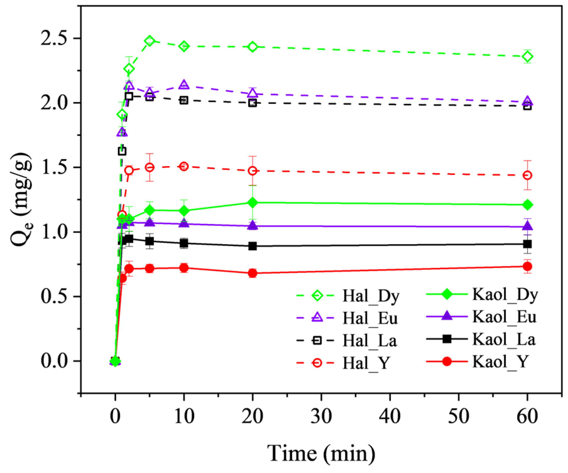 Time-dependent curves of the unit adsorption capacity of La3+, Y3+, Eu3+, and Dy3+ by kaolinite and halloysite.