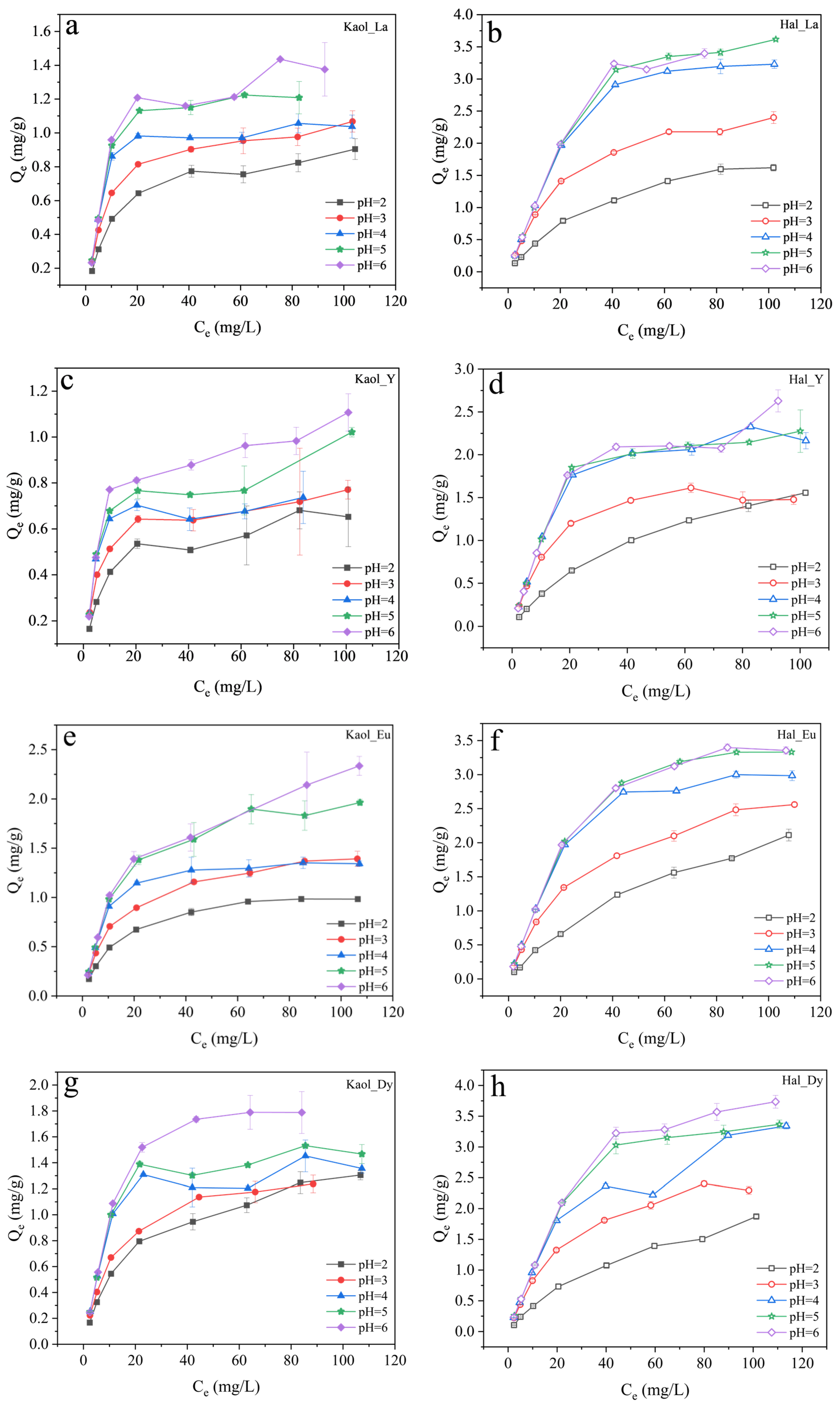 Adsorption curves of La3+ (a,b), Y3+ (c,d), Eu3+ (e,f), and Dy3+ (g,h) by kaolinite (a,c,e,g) and halloysite (b,d,f,h) with different initial REE concentrations at different pH values.
