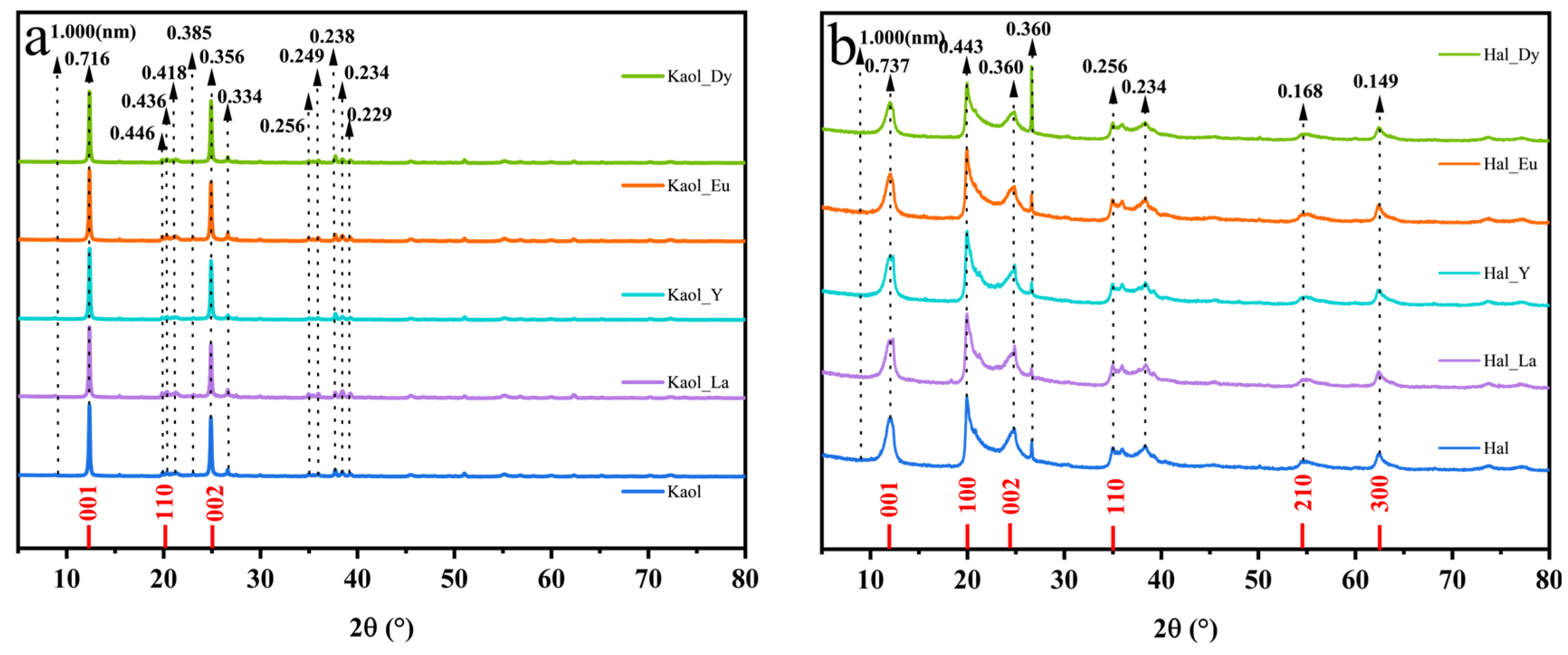 XRD patterns of kaolinite (a) and halloysite (b) before and after the adsorption of La3+, Y3+, Eu3+, and Dy3+.