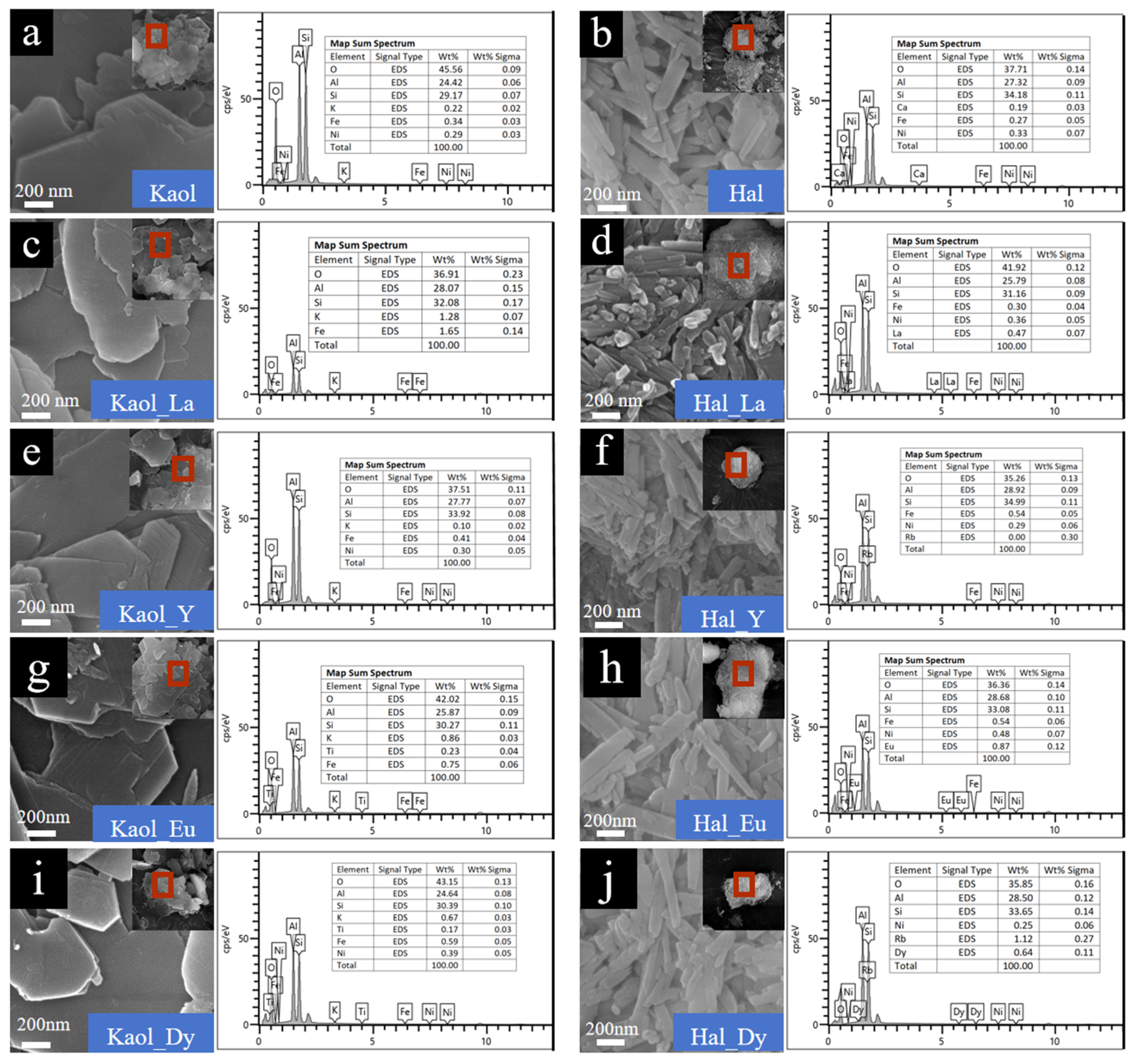 SEM images and EDS results of pristine kaolinite (a), pristine halloysite (b), kaolinite (c,e,g,i) and halloysite (d,f,h,j) after the adsorption of La3+ (c,d), Y3+ (e,f), Eu3+ (g,h) and Dy3+ (i,j).