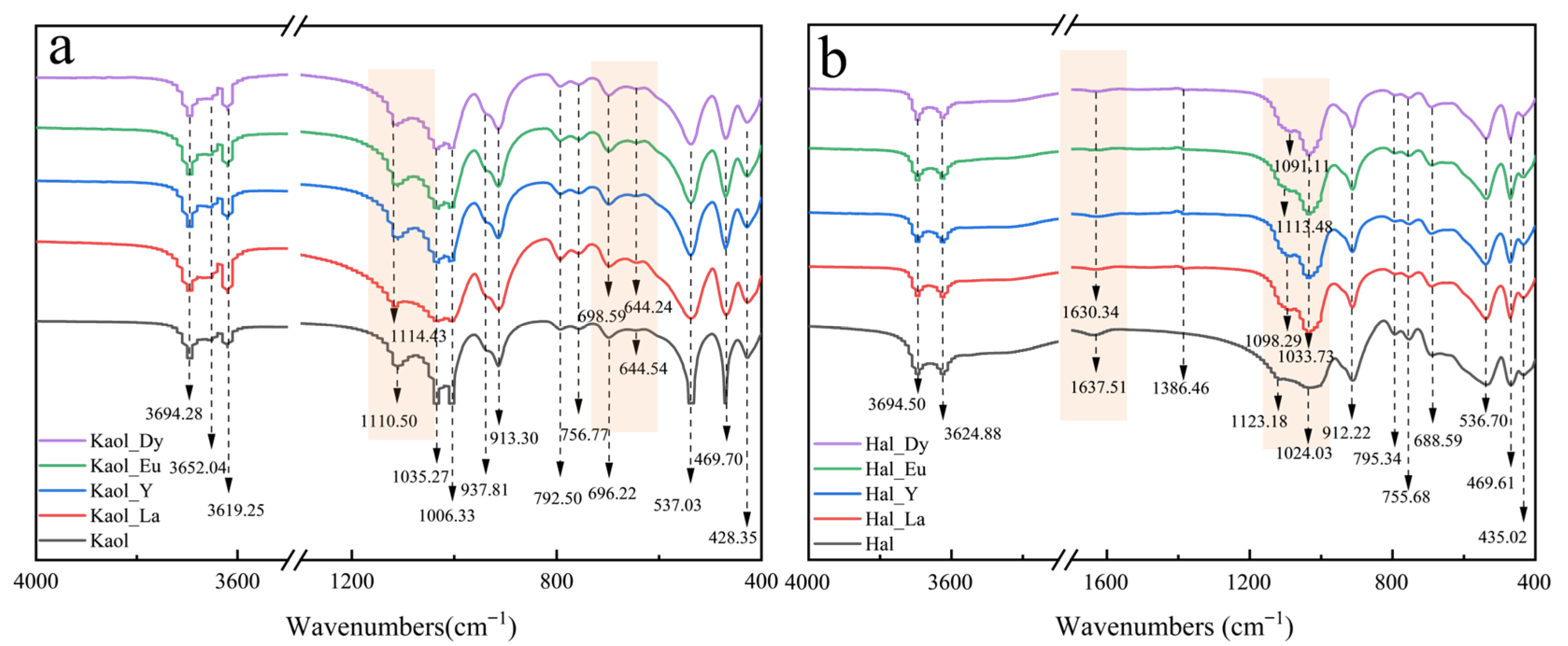 FT-IR spectra of kaolinite (a) and halloysite (b) before and after the adsorption of La3+, Y3+, Eu3+, and Dy3+.